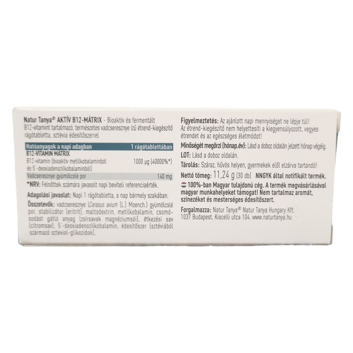 A Natur Tanya® Aktív B12-mátrix egy bioaktív és fermentált B12-vitamin tartalmú étrend-kiegészítő rágótabletta, mely természetes vadcseresznye ízzel készül. A termék 1000 µg B12-vitamint tartalmaz metilkobalamin és 5-deoxiadenozilkobalamin formájában, továbbá vadcseresznye gyümölcslé porral egészül ki. Édesítőszerként sztéviából származó szteviol-glikozidokat használ, és nem tartalmaz aromát, színezéket vagy mesterséges édesítőszert. A csomósodást gátló anyag zsír- és magnéziumsókat foglal magában, stabilizátorként eritrit szolgál. A termék 30 darabos kiszerelésben, 11,24 g nettó tömegben érhető el, és a Natur Tanya® által forgalmazott, 100%-ban magyar tulajdonú cég által gyártott termék, amely megvásárlásával magyar munkahelyek támogathatók.