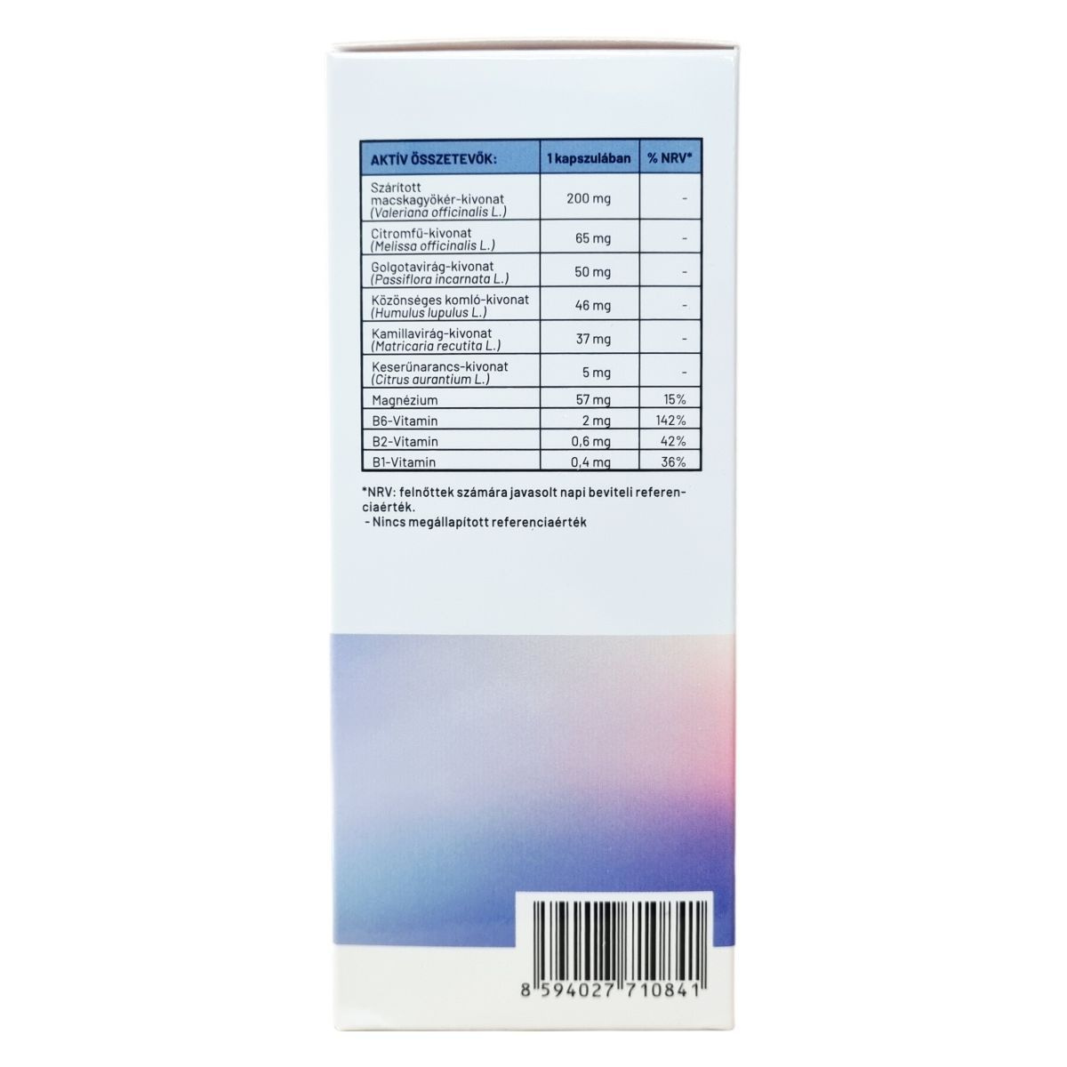 Macskagyökér alapú kapszula gyógynövény-kivonatokkal, B-vitaminokkal és magnéziummal, melyek hozzájárulhatnak a nyugodt és pihentető alváshoz és az idegrendszer egészségéhez.