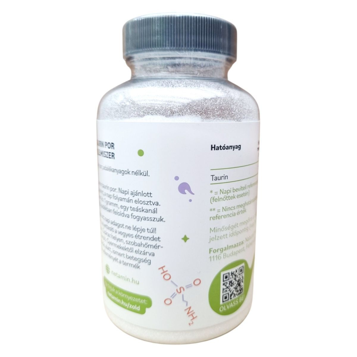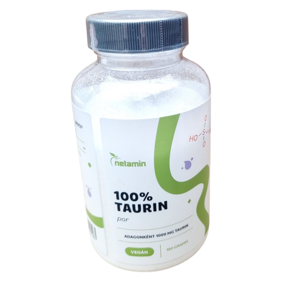 A Netamin 100% Taurin por egy funkcionális élelmiszer, amely tiszta taurin port tartalmaz adalékanyagok nélkül. A termék vegán, így különböző étrendi irányzatokba is beilleszthető. A taurin egy fontos aminosav, amely különböző élettani folyamatokban játszhat szerepet. A termék napi ajánlott mennyisége 1-3 gramm, amelyet egyéni igény szerint, a nap folyamán elosztva lehet fogyasztani. A port folyadékban feloldva ajánlott fogyasztani. A termék használata előtt, különösen terhesség, szoptatás vagy ismert betegség esetén, javasolt orvosi konzultáció.
