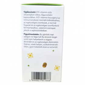 A D3-vitamin (kolekalciferol) egy zsírban oldódó vitamin és prohormon, amely a szervezetben aktív hormonszerű vegyületté alakul. A bőrben UVB-sugárzás hatására képződik, majd a májban és a vesében történő átalakulás után a kalcium- és foszfát-anyagcsere szabályozásában játszik szerepet. Hozzájárulhat a normál csontozat és fogazat fenntartásához, valamint támogathatja az immunrendszer megfelelő működését. Részt vesz a sejtosztódási folyamatok szabályozásában és az izomműködés fenntartásában is. Hiánya csökkent napfény-expozíció vagy elégtelen bevitel esetén alakulhat ki. Megfelelő adagolás mellett biztonságos, ugyanakkor túladagolása hiperkalcémiához vezethet. Egyéni egészségügyi állapot vagy gyógyszerszedés esetén javasolt szakemberrel konzultálni.