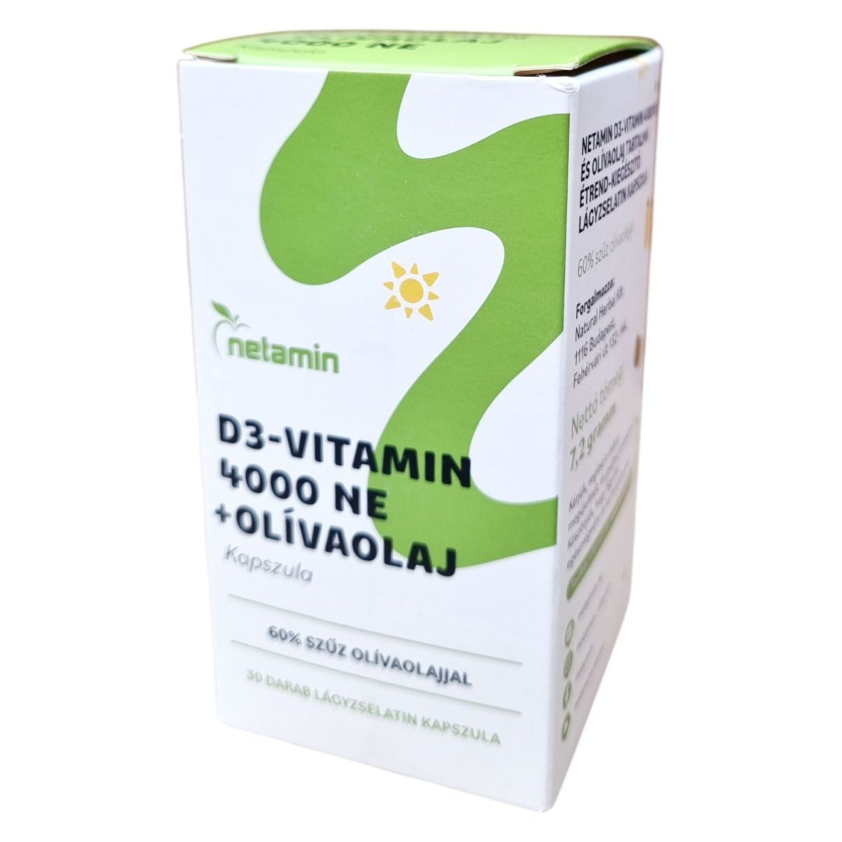 A Netamin D3-Vitamin 4000 NE + Olívaolaj lágyzselatin kapszula egy étrend-kiegészítő, amely 60% szűz olívaolajat tartalmaz. A D3-vitamin hozzájárulhat az immunrendszer normál működéséhez, az egészséges csontozat, a normál fogazat és az egészséges izomfunkció fenntartásához, valamint szerepet játszhat a sejtosztódásban. A termék 30 darab lágyzselatin kapszulát tartalmaz, és napi 1 kapszula szedése javasolt étkezés közben. A termék forgalmazója a Natural Herbal Kft., és a kapszulák szűz olívaolajban oldott D3-vitamint tartalmaznak.