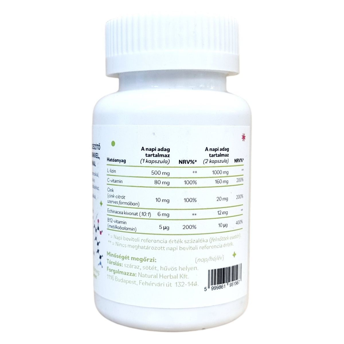 L-lizin, növényi kapszulahéj (hidroxipropil-metilcellulóz), C-vitamin (L-aszkorbinsav), cink-citrát, csomósodást gátló anyagok (zsírsavak magnéziumsói, szilícium-dioxid), bíbor kasvirág (Echinacea purpurea) föld feletti rész kivonat, B12-vitamin (metilkobalamin)