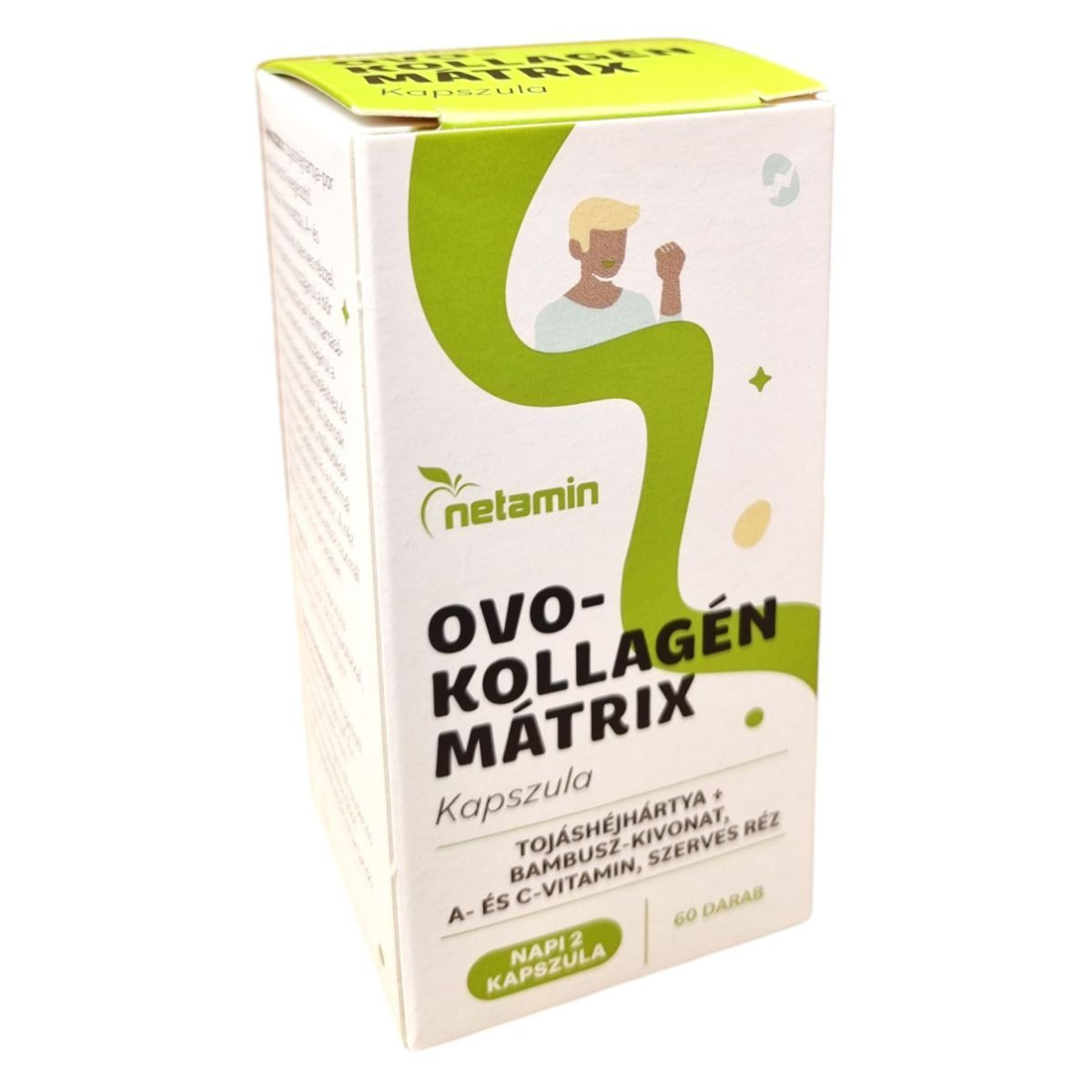 A Netamin OVO-KOLLAGÉN MÁTRIX kapszula egy speciális étrend-kiegészítő, amely tojáshéjhártya-por, bambusz-kivonat, A- és C-vitamin, valamint szerves réz kombinációját tartalmazza. Az A-vitamin hozzájárulhat a bőr normál állapotának fenntartásához, míg a C-vitamin támogathatja a normál kollagénképződést, ami fontos lehet a bőr, porcok és csontozat egészsége szempontjából. A réz részt vehet a kötőszövetek normál állapotának fenntartásában. A termék napi adagja 2 kapszula, amelyet bő folyadékkal, lehetőleg étkezés közben ajánlott bevenni. A termék forgalmazója a Natural Herbal Kft., és a kapszulák 60 darabos kiszerelésben kaphatók.