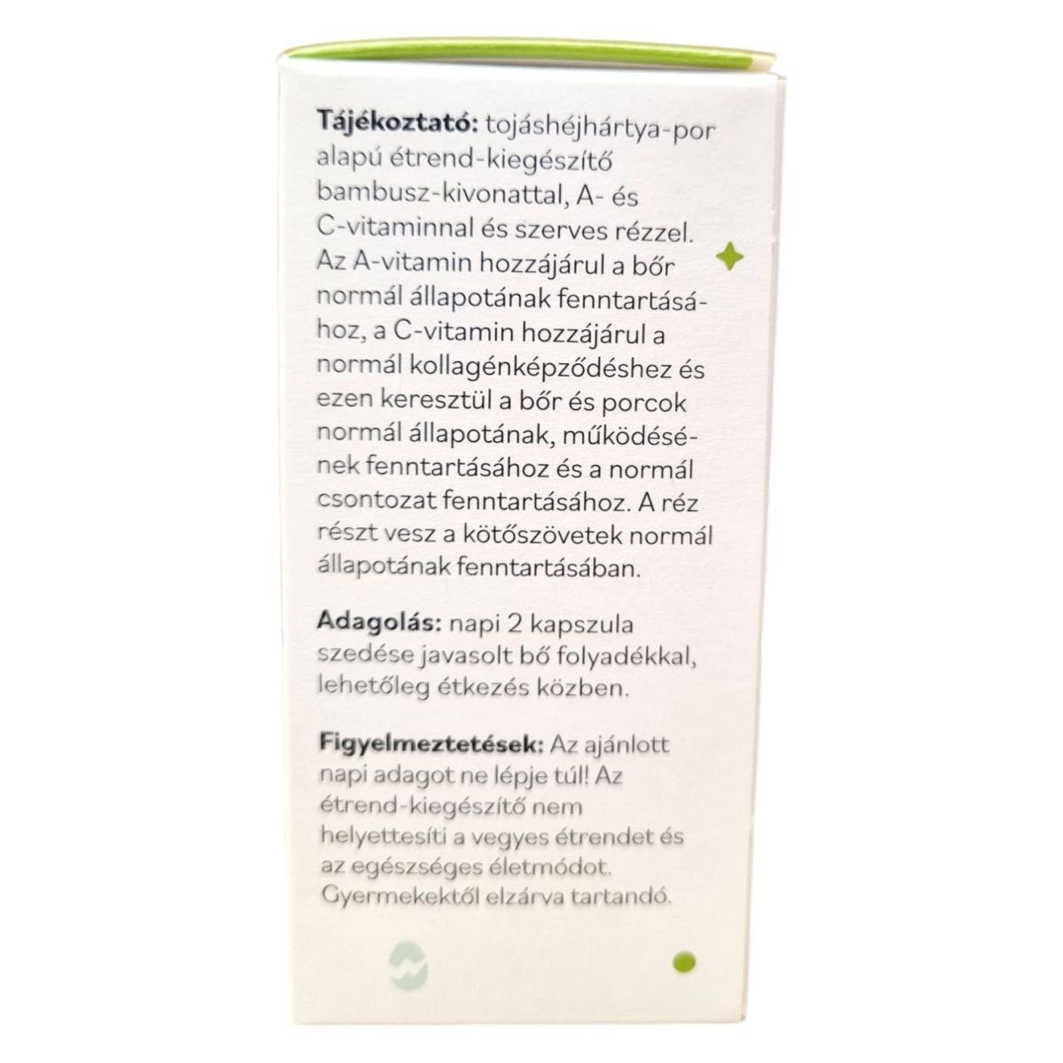 C-vitamin (L-aszkorbinsav), tojáshéjhártya-por, növényi kapszulahéj (hidroxipropil-metilcellulóz), bambusz-kivonat, réz(II)-glükonát, A-vitamin (retinol).
