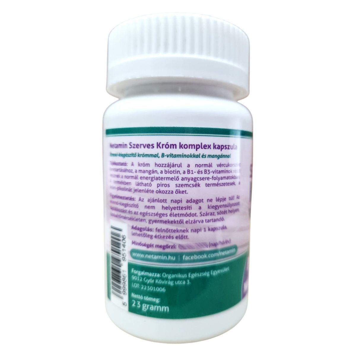 A Netamin Szerves Króm komplex kapszula egy étrend-kiegészítő, amely krómot, B-vitaminokat és mangánt tartalmaz. A króm hozzájárulhat a normál vércukorszint fenntartásához, míg a mangán, a biotin, a B1- és B3-vitaminok részt vehetnek a normál energiatermelő anyagcsere-folyamatokban. A kapszulákban látható piros szemcsék természetesek, a króm-pikolinát jelenléte okozza őket. A termék bio étrendi irányzatba illeszkedik, és fontos, hogy az ajánlott napi adagot ne lépjük túl. A termék nem helyettesíti a kiegyensúlyozott étrendet és az egészséges életmódot.