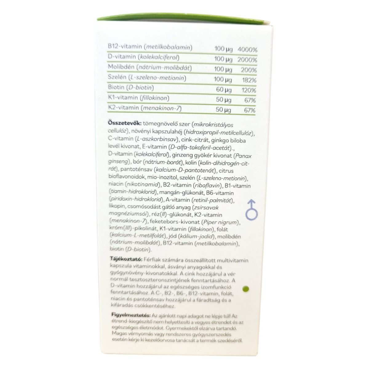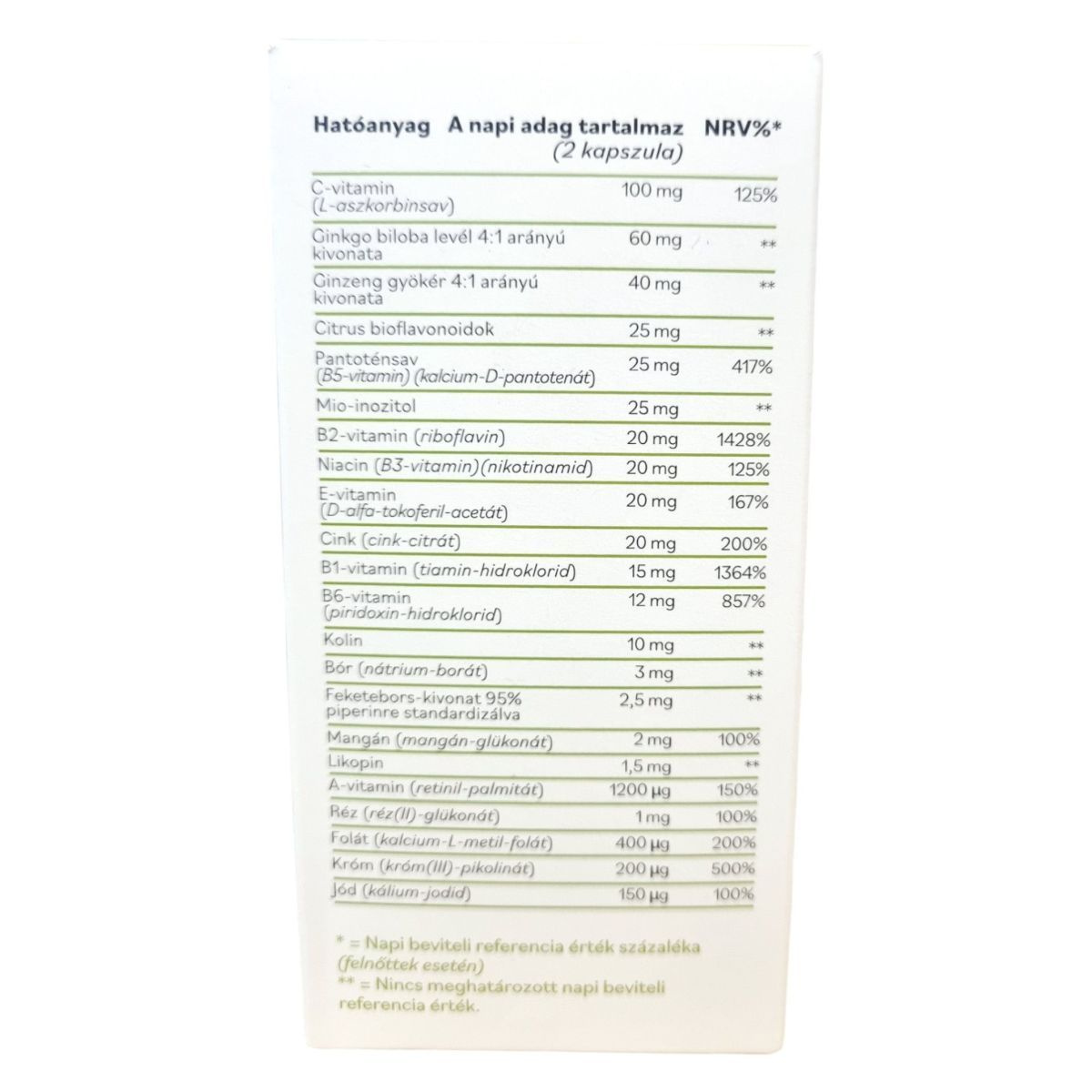 tömegnövelő szer (mikrokristályos cellulóz), növényi kapszulahéj (hidroxipropil-metilcellulóz), C-vitamin (L-aszkorbinsav), cink-citrát, ginkgo biloba levél kivonat, E-vitamin (D-alfa-tokoferil-acetát), D-vitamin (kolekalciferol), ginzeng gyökér kivonat (Panax ginseng), bór (nátrium-borát), kolin (kolin-dihidrogén-citrát), pantoténsav (kalcium-D-pantotenát), citrus bioflavonoidok, mio-inozitol, niacin (nikotinamid), B2-vitamin (riboflavin), B1-vitamin (tiamin-hidroklorid), mangán-glükonát, B6-vitamin (piridoxin-hidroklorid), A-vitamin (retinil-palmitát), likopin, csomósodást gátló anyag (zsírsavak magnézium sói), réz(II)-glükonát, K2-vitamin (menakinon-7), feketebors-kivonat (Piper nigrum), króm(III)-pikolinát, K1-vitamin (fillokinon), folát (kalcium-L-metil-folát), jód (kálium-jodid), molibdén (nátrium-molibdát), B12-vitamin (metilkobalamin), biotin (D-biotin).