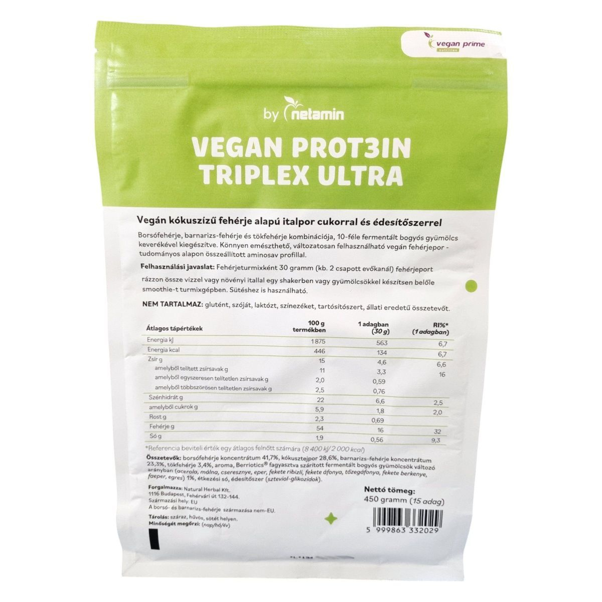 A Netamin VEGAN PROT3IN TRIPLEX ULTRA egy kókuszízű vegán fehérje alapú italpor, amely borsó-, barnarizs- és tökfehérje kombinációját tartalmazza, kiegészítve 10-féle fermentált bogyós gyümölcs keverékével. A termék könnyen emészthető és változatosan felhasználható, például turmixokhoz vagy sütéshez. A termék nem tartalmaz glutént, szóját, laktózt, színezéket, tartósítószert és állati eredetű összetevőt, így különösen alkalmas vegán étrendet követők számára. A termék 450 grammos kiszerelésben kapható, amely 15 adagot tartalmaz.