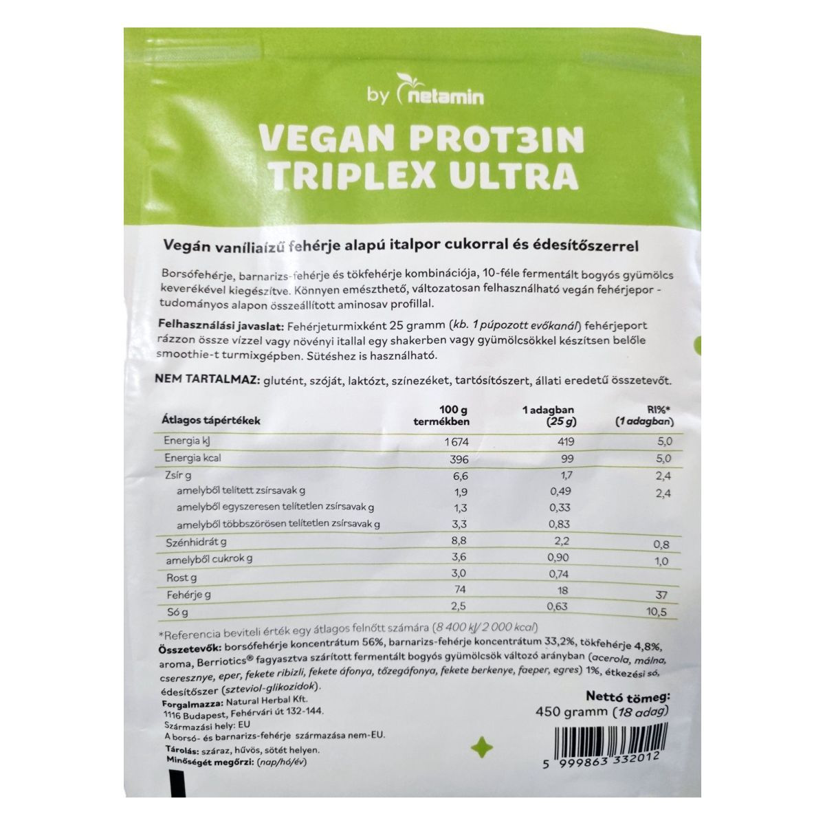 A Netamin VEGAN PROT3IN TRIPLEX ULTRA egy vegán vaníliaízű fehérje alapú italpor, amely borsó-, barnarizs- és tökfehérje kombinációját tartalmazza. A termék 10-féle fermentált bogyós gyümölcs keverékével van kiegészítve, amely segíthet a fehérjebevitel növelésében és változatosan felhasználható. A termék nem tartalmaz glutént, szóját, laktózt, színezéket, tartósítószert és állati eredetű összetevőket. A termék könnyen emészthető és tudományos alapon összeállított aminosav profillal rendelkezik. A termék forgalmazója a Natural Herbal Kft., és a termék származási helye az EU, a borsó- és barnarizs-fehérje származása nem-EU.