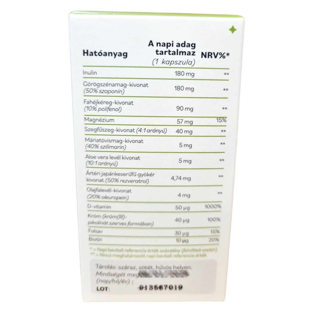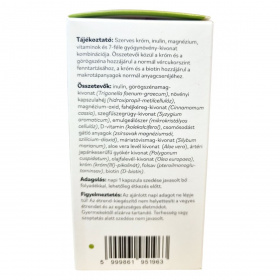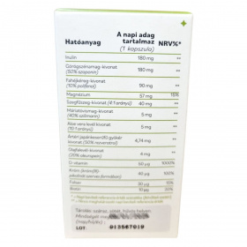Inulin, görögszénamag-kivonat (Trigonella foenum-graecum), növényi kapszulahéj (hidroxipropil-metilcellulóz), magnézium-oxid, fahéjkéreg-kivonat (Cinnamomum cassia), szegfűszegvirág-kivonat (Syzygium aromaticum), emulgeálószer (mikrokristályos cellulóz), D-vitamin (kolekalciferol), csomósodást gátló anyagok (zsírsavak magnézium sói, szilícium-dioxid), máriatövismag-kivonat (Silybum marianum), aloe vera levél kivonat (Aloe vera), ártéri japánkeserűfű gyökér kivonat (Polygonum cuspidatum), olajfalevél-kivonat (Olea europaea), króm (króm(III)-pikolinát), folsav (pteroilmonoglutaminsav), biotin (D-biotin).