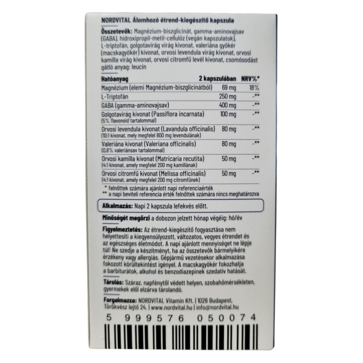 A NORDVITAL Álomhozó étrend-kiegészítő kapszula egy vegán, GMO-mentes, gluténmentes és laktózmentes termék, amely magnéziumot, valeriánát, kamillát és citromfüvet tartalmaz. Ezek az összetevők hozzájárulhatnak az idegrendszer normál működéséhez, segíthetnek a relaxáció elősegítésében és a természetes alvás fenntartásában. A termék napi adagja 2 kapszula, amelyet lefekvés előtt ajánlott bevenni. A termék laborban bevizsgált, és karbonsemleges vállalat által forgalmazott. A fogyasztása nem helyettesíti a kiegyensúlyozott étrendet és az egészséges életmódot. Tárolása száraz, napfénytől védett helyen javasolt.