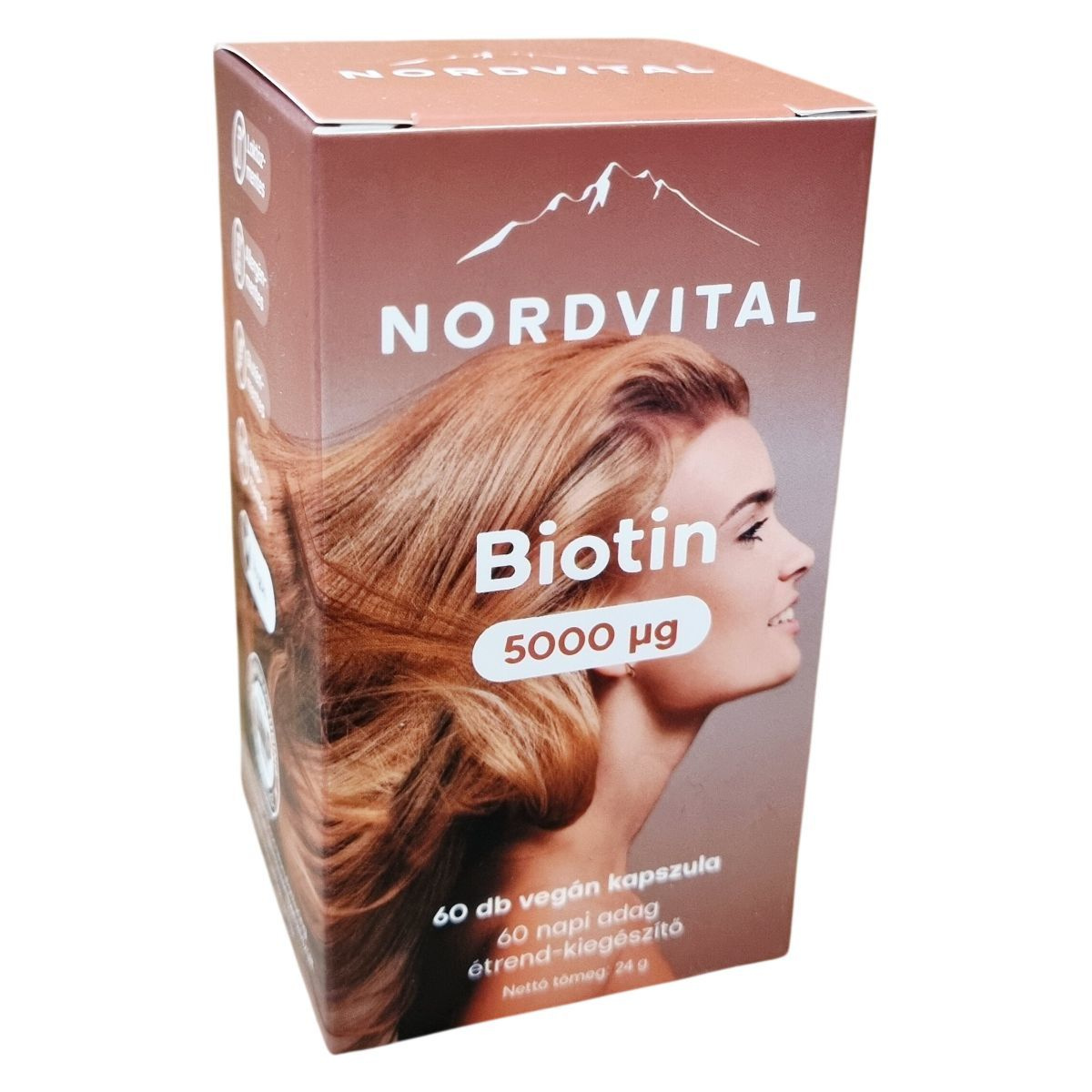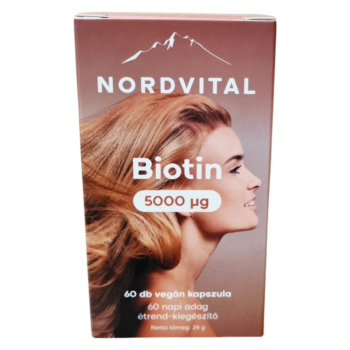 A Nordvital Biotin (B7-vitamin) kapszula 5000 µg biotint tartalmaz kapszulánként, támogatva a biotin pótlását. A kapszula vegán összetételű, rizslisztből és hidroxipropil-metil-cellulózból készül, a csomósodás gátlására leucin aminosavat tartalmaz. A termék 60 napi adagot biztosít 24 g nettó tömeggel. Az étrend-kiegészítő laktóz-, allergén-, glutén- és GMO-mentes, valamint GMP-minősítéssel rendelkező gyártóüzemben készül, amely megfelel a hatósági előírásoknak. A termék célja a normál bőr- és hajállapot fenntartásának, valamint az energia- és makrotápanyag-anyagcsere, az idegrendszer és a pszichológiai működés támogatása a megfelelő biotin ellátás biztosításával.