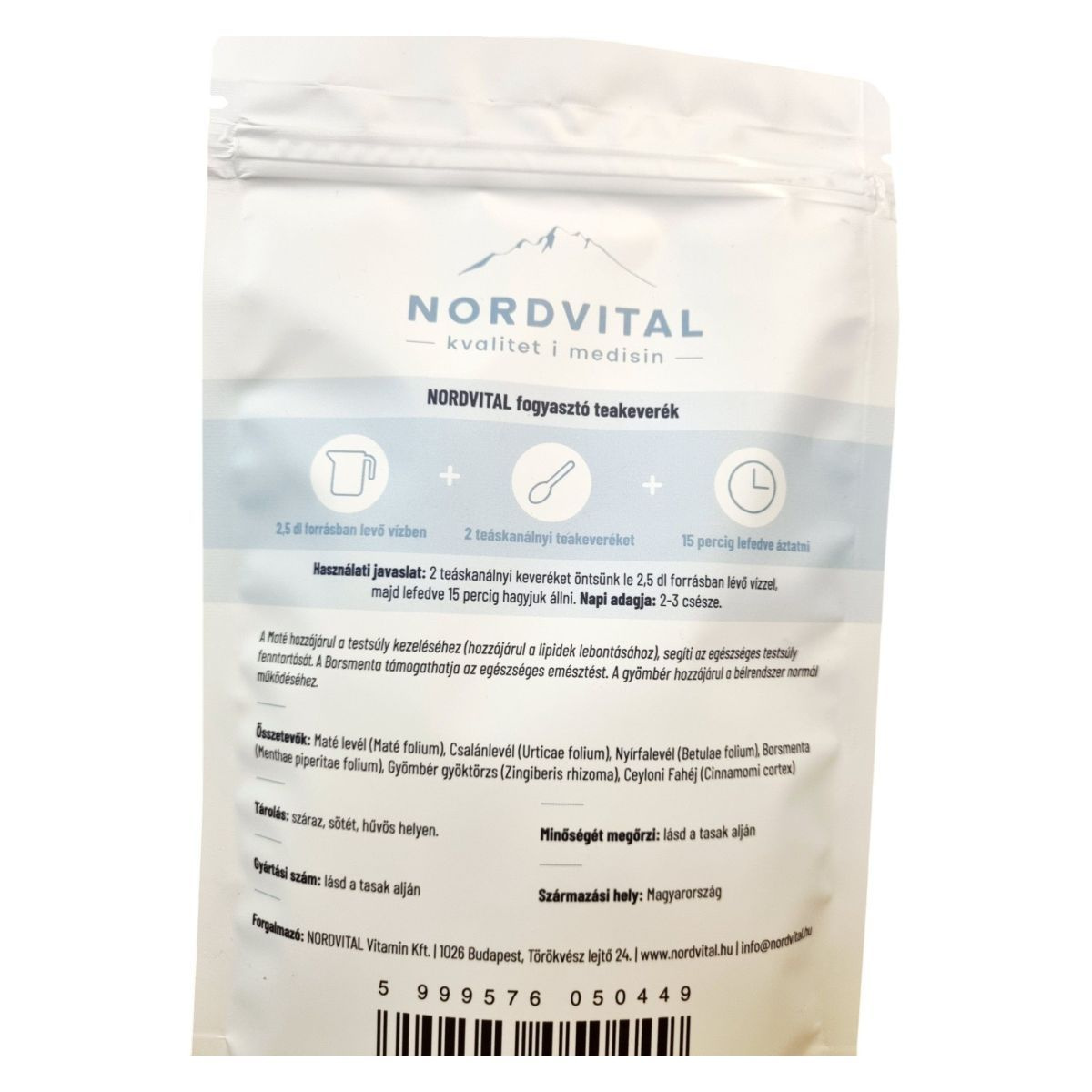 A NORDVITAL fogyasztó teakeverék egy 100% natúr gyógynövényekből készült termék, amely segíthet a testsúly kezelésében és az egészséges emésztés támogatásában. A termék fő összetevői között megtalálható a Maté levél, amely hozzájárulhat a lipidek lebontásához, a Borsmenta, amely támogathatja az emésztést, valamint a Gyömbér, amely hozzájárulhat a bélrendszer normál működéséhez. A teakeverék használata egyszerű: 2 teáskanálnyi keveréket kell 2,5 dl forrásban lévő vízbe áztatni 15 percig. A termék Magyarországon készül, és a NORDVITAL Vitamin Kft. forgalmazza.