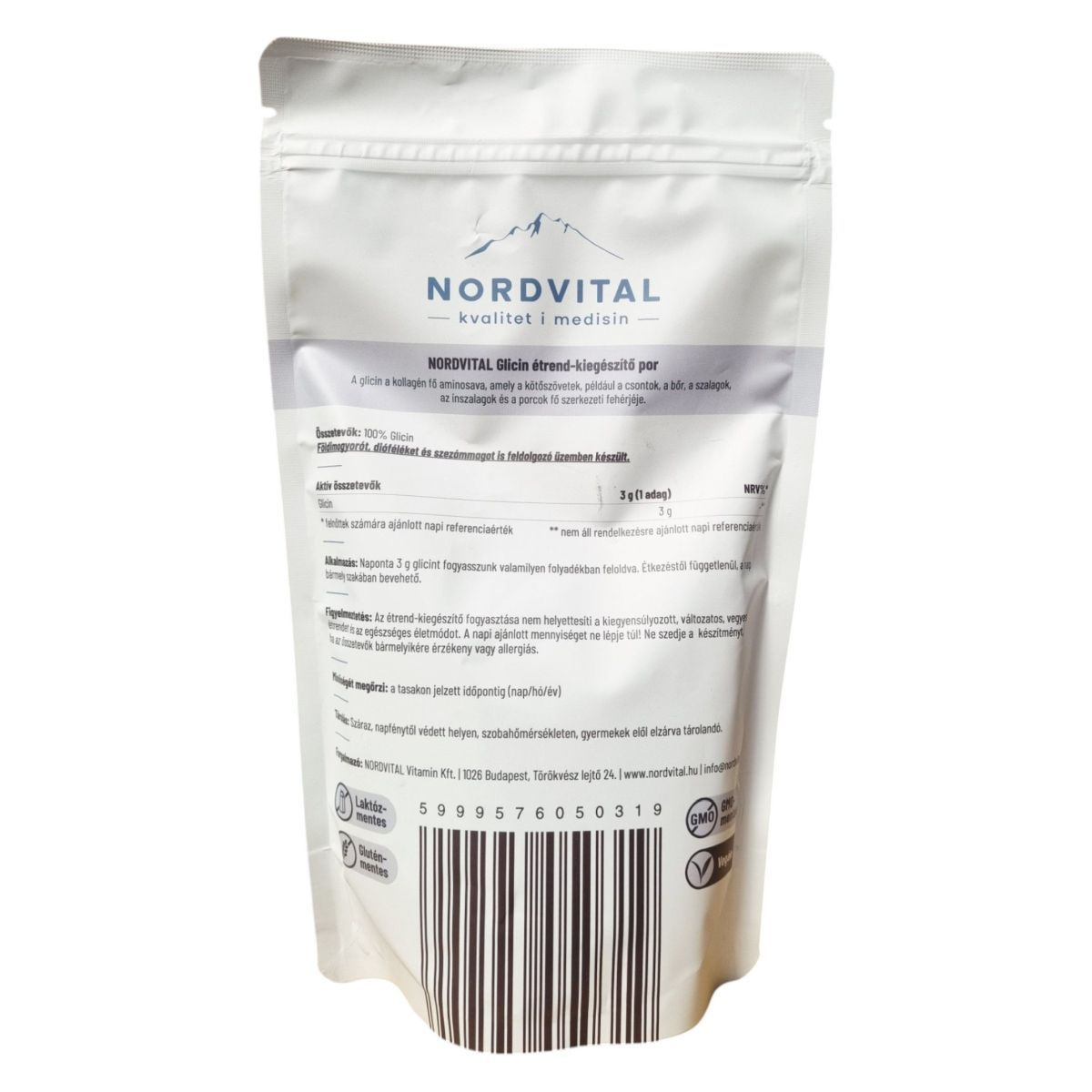 A NORDVITAL Glicin étrend-kiegészítő por a kollagén fő aminosavát, a glicint tartalmazza, amely a kötőszövetek, például a csontok, a bőr, a szalagok, az ínszalagok és a porcok fő szerkezeti fehérjéje lehet. A termék 166 adagot tartalmaz, és vegán, GMO-mentes, gluténmentes, valamint laktózmentes. A glicin fogyasztása hozzájárulhat a szervezet kollagénszintjének fenntartásához. A termék földimogyorót, dióféléket és szezámmagot is feldolgozó üzemben készült, ezért allergiások számára körültekintést igényelhet.