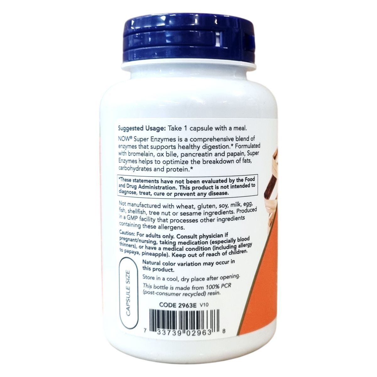 A NOW Super Enzymes enzimek komplex keverékét tartalmazza, amely bromelaint, ox epe kivonatot, pancreatint és papaint foglal magában. Ezek az enzimek segíthetik a zsírok, szénhidrátok és fehérjék optimális lebontását az emésztés során. A készítmény nem tartalmaz allergéneket, például búzát, glutént vagy tejtermékeket, és GMP tanúsítvánnyal rendelkező üzemben készül, amely megfelel a minőségi előírásoknak. Az összetevők globálisan beszerzettek, és az USA-ban gyártják, majd minőségileg tesztelik. A kapszula mérete 7, és a palack PET anyaga 100%-ban újrahasznosított műanyagból készül. A termék természetes színeltéréseket mutathat. Az állításokat az FDA nem értékelte, a termék nem alkalmas betegségek diagnosztizálására, kezelésére vagy megelőzésére.