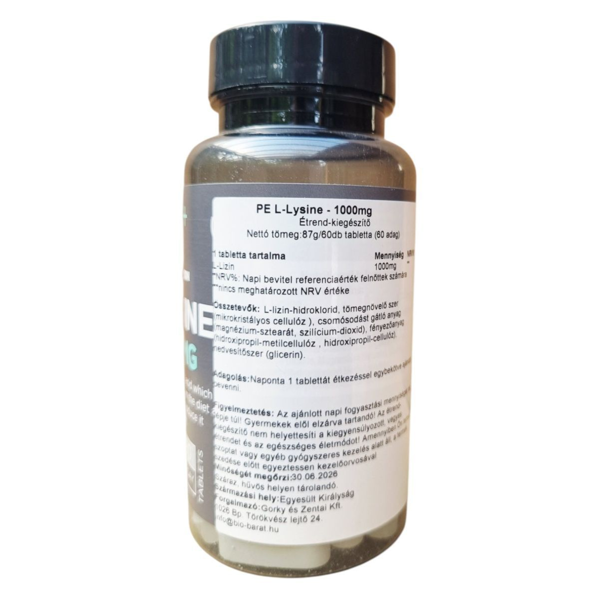 A PE NUTRITION L-LYSINE 1000mg egy étrend-kiegészítő, amely esszenciális aminosavat, L-Lizint tartalmaz. Ez az aminosav fontos szerepet játszhat a szervezet fehérjeszintézisében és az immunrendszer támogatásában. A termék vegán étrendbe illeszthető, és napi egy tabletta fogyasztása ajánlott étkezéssel együtt. Az étrend-kiegészítő nem helyettesíti a kiegyensúlyozott étrendet és az egészséges életmódot. A terméket száraz, hűvös helyen kell tárolni, és gyermekek elől elzárva tartani. A gyártó a Törökverő és Zentai Kft., amelynek székhelye Budapesten található.