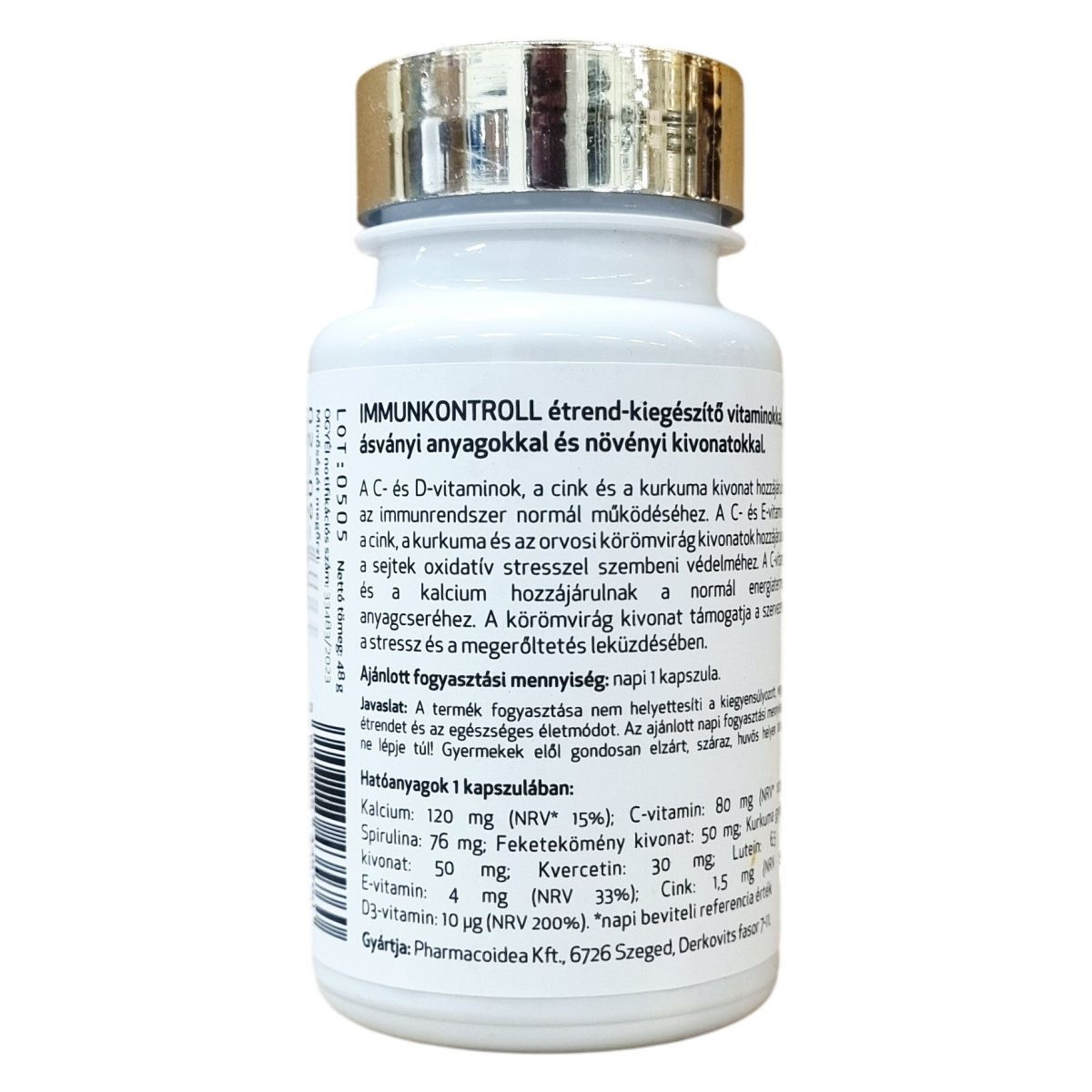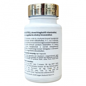 Az IMMUNKONTROLL étrend-kiegészítő C- és D-vitaminokat, cinket, kurkuma- és orvosi körömvirág kivonatokat tartalmaz, melyek hozzájárulhatnak az immunrendszer normál működéséhez és a sejtek oxidatív stresszel szembeni védelméhez. E-vitamin és kalcium jelenléte támogathatja a normál energiatermelő anyagcserét. A körömvirág kivonat a stressz és megerőltetés leküzdésében támogathatja a szervezetet.