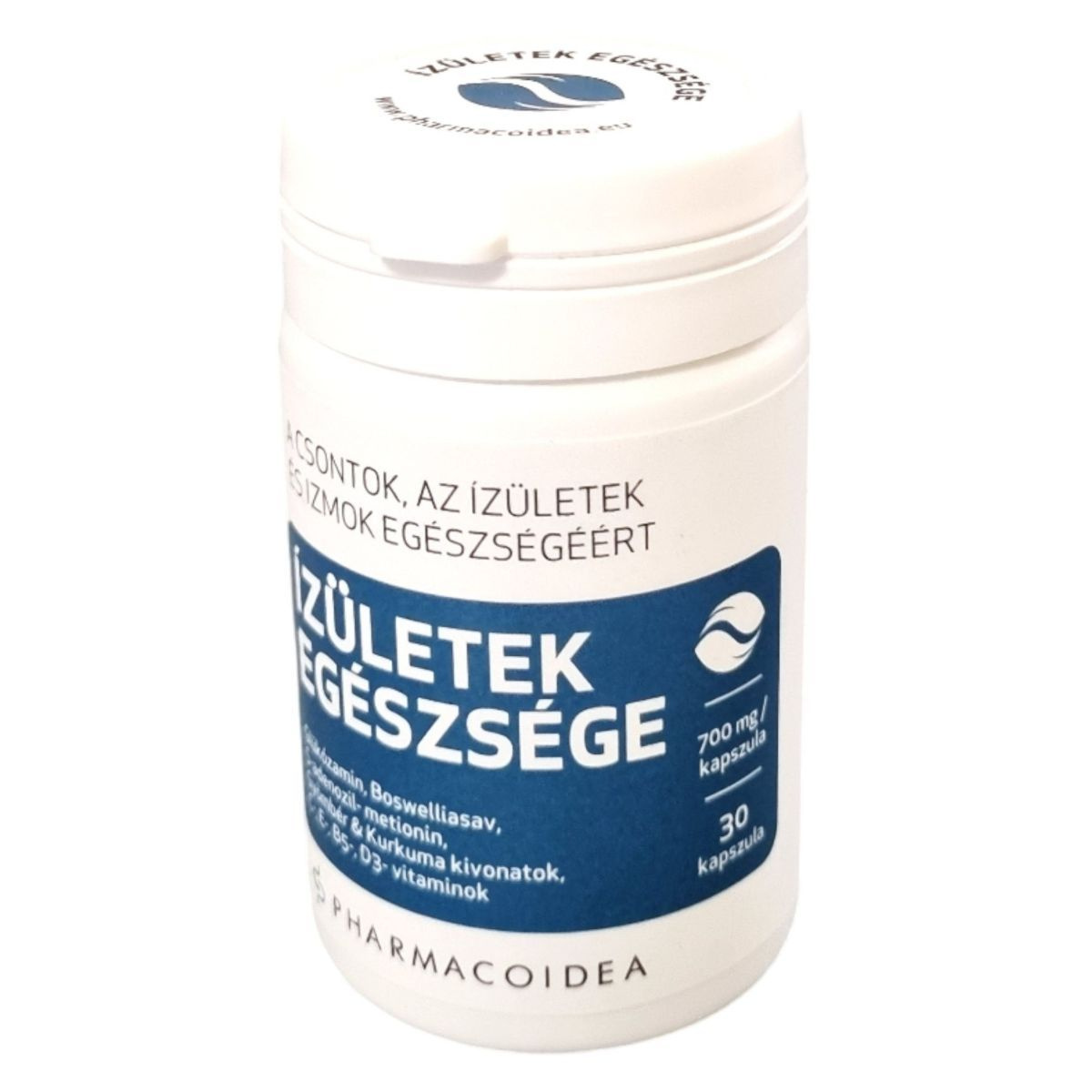 A Pharmacoidea Ízületek Egészsége kapszula olyan hatóanyagokat tartalmaz, mint a glükózamin, boswelliasav, S-adenozil-metionin, gyömbér és kurkuma kivonatok, valamint C, E, B5 és D3 vitaminok. Ezek az összetevők hozzájárulhatnak a csontok, ízületek és izmok normál funkciójának fenntartásához, a gyulladásos válasz szabályozásához, valamint a megfelelő kollagén képződéshez. A termék napi 1 kapszula fogyasztásával támogathatja a szervezet ezen funkcióit. A terméket a Pharmacoidea Kft. gyártja, és OGYÉI notifikációs számmal rendelkezik.