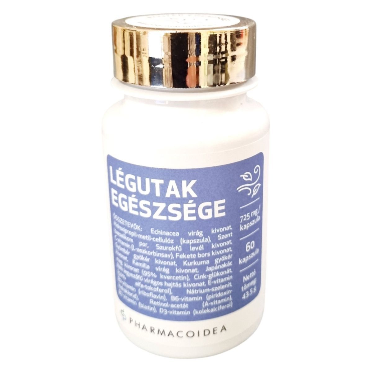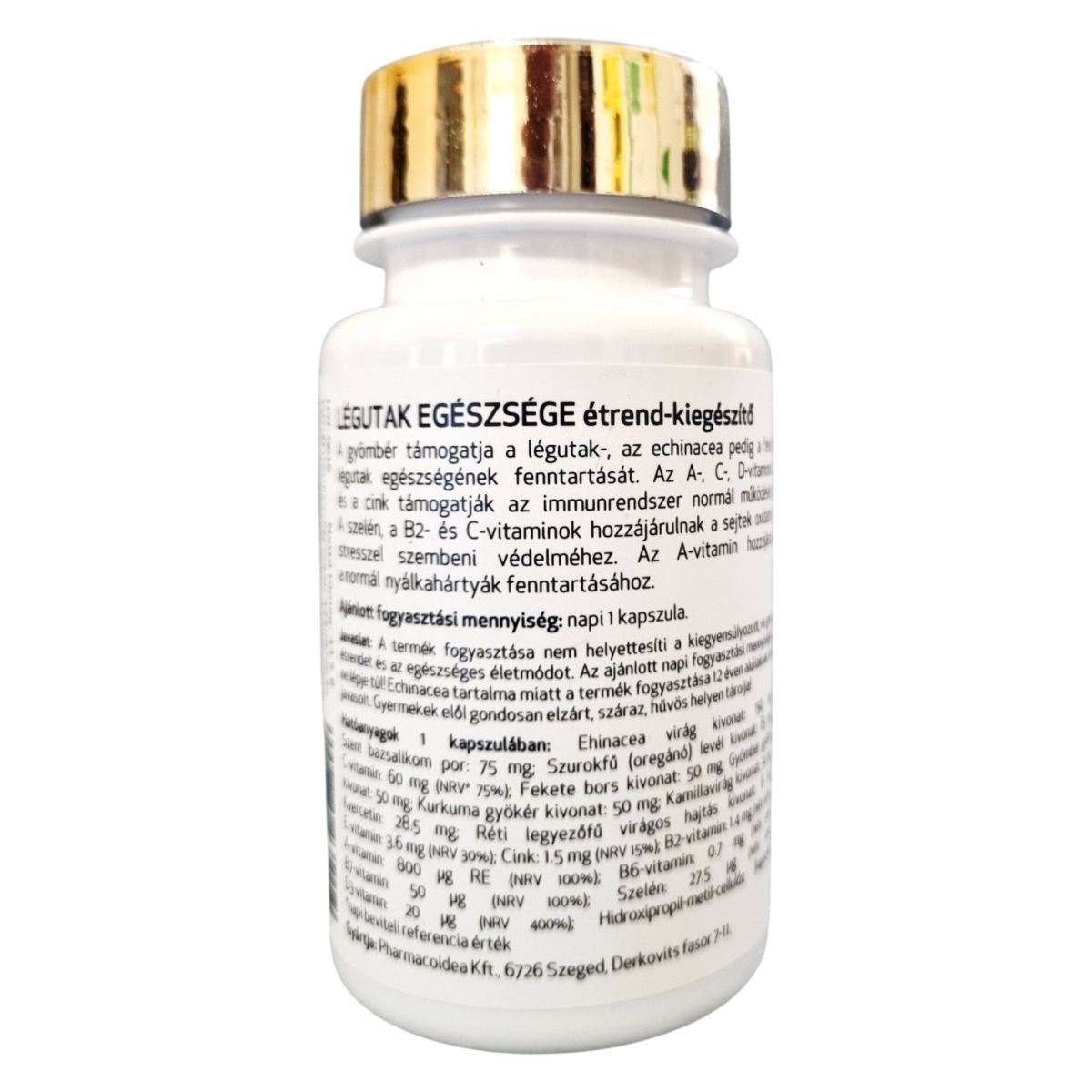 A LÉGUTAK EGÉSZSÉGE étrend-kiegészítő a légutak és az immunrendszer támogatására lett kifejlesztve. Az echinacea és a gyömbér hozzájárulhatnak a légutak egészségének fenntartásához, míg az A-, C-, D-vitaminok és a cink az immunrendszer normál működését támogathatják. A szelén, a B2- és C-vitaminok antioxidáns hatásukkal segíthetnek a sejtek oxidatív stresszel szembeni védelmében. Az A-vitamin a normál nyálkahártyák fenntartásához járulhat hozzá.