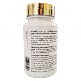 A NORMÁL SEJTOSZTÓDÁS étrend-kiegészítő a Pharmacoidea Kft. terméke, amely különböző gyógynövény kivonatokat, vitaminokat és cinket tartalmaz. A termék célja, hogy támogassa az immunrendszer normál működését és védje a sejteket az oxidatív stresszel szemben. A benne található C-vitamin, Ginzeng gyökér, Gyömbér gyökér, Fokhagyma és Kurkuma gyökér kivonatok hozzájárulhatnak az immunrendszer normál működéséhez. A cink és a D3-vitamin szerepet játszhatnak a sejtosztódás folyamatában. Az ajánlott napi fogyasztási mennyiség 1 kapszula, amely biztosítja a szükséges hatóanyagokat a szervezet számára.