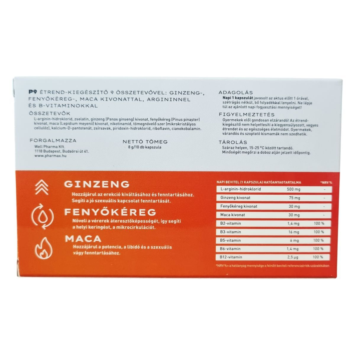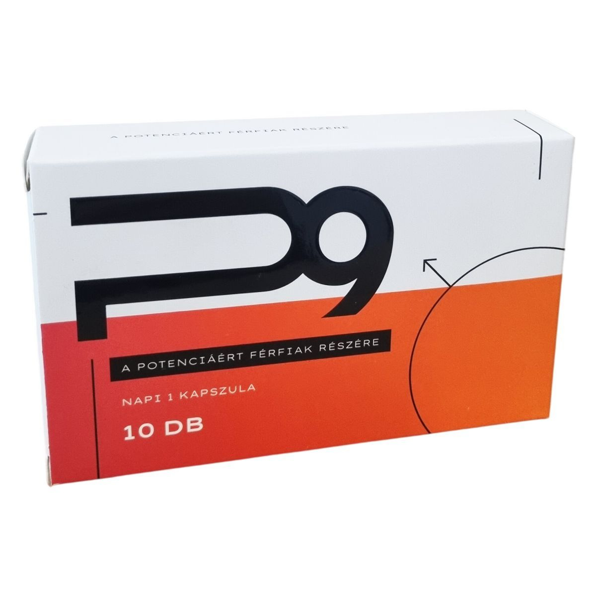 A P9 étrend-kiegészítő 9 hatóanyagból áll, többek között ginzeng, fenyőkéreg, maca kivonatokból, argininnel és B-vitaminokkal. A ginzeng hozzájárulhat az erekció kiváltásához és fenntartásához, segítheti a jó szexuális kapcsolat fenntartását. A fenyőkéreg növelheti a vérerek áteresztőképességét, ezáltal támogathatja a helyi keringést és mikrocirkulációt. A maca hozzájárulhat a potencia, a libidó és a szexuális vágy fenntartásához. A készítmény napi 1 kapszula adagban alkalmazandó aktus előtt, szétrágás nélkül, bő folyadékkal lenyelve. Az étrend-kiegészítő nem alkalmas gyermekek, várandós és szoptató kismamák számára, és nem helyettesíti a kiegyensúlyozott étrendet és egészséges életmódot.