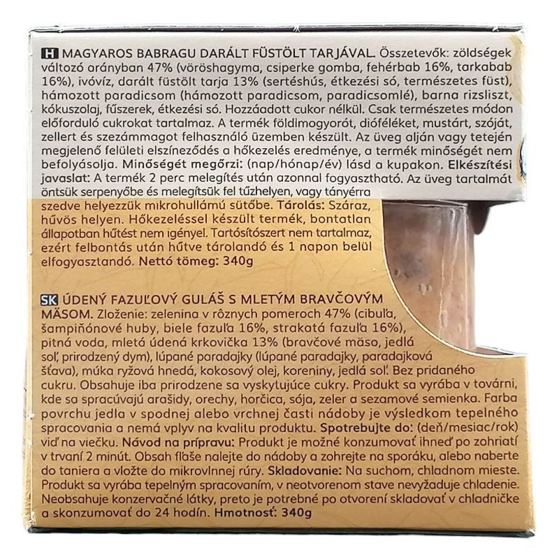 Összetevők: bab, darált füstölt tarja, hagyma, paprika, só, fűszerek.