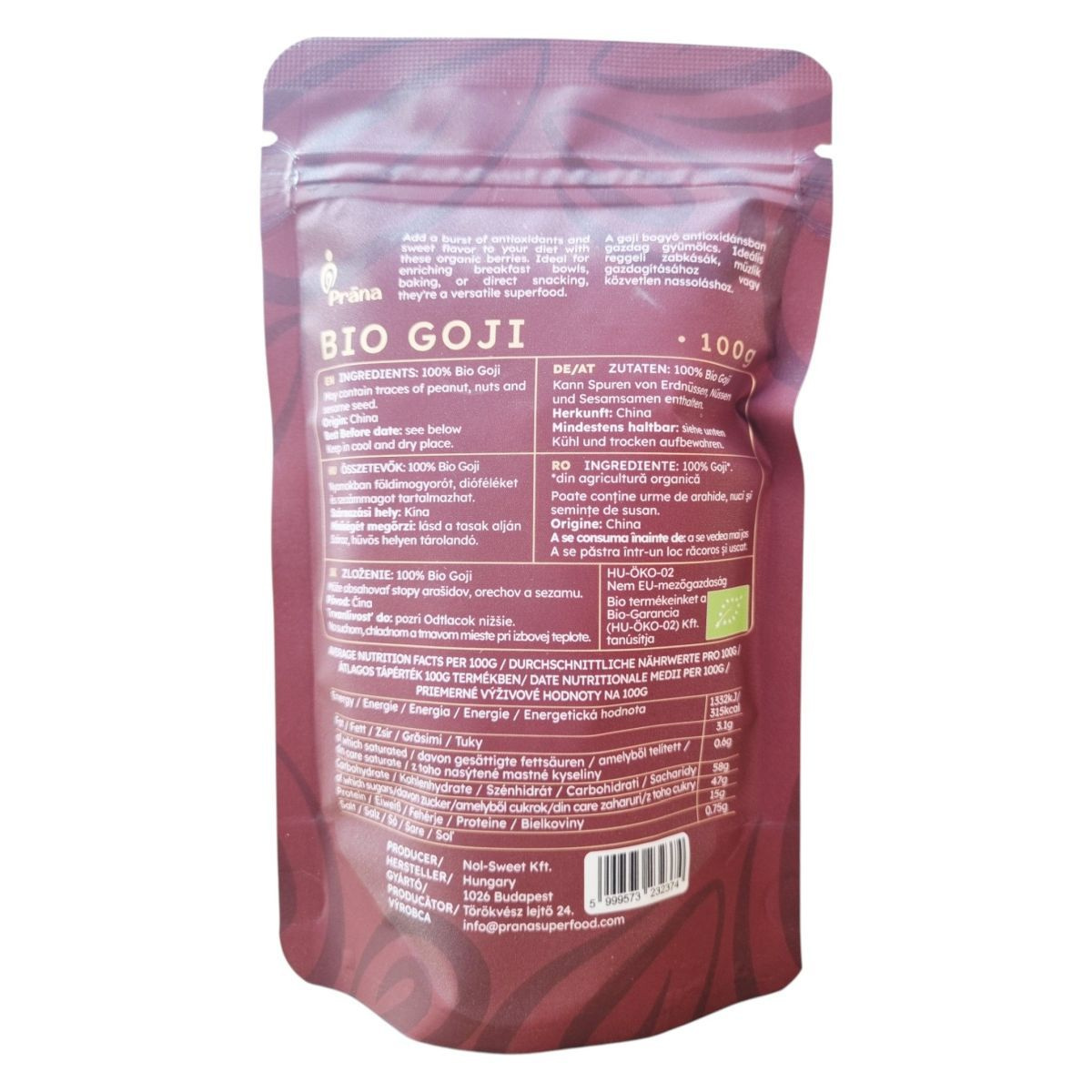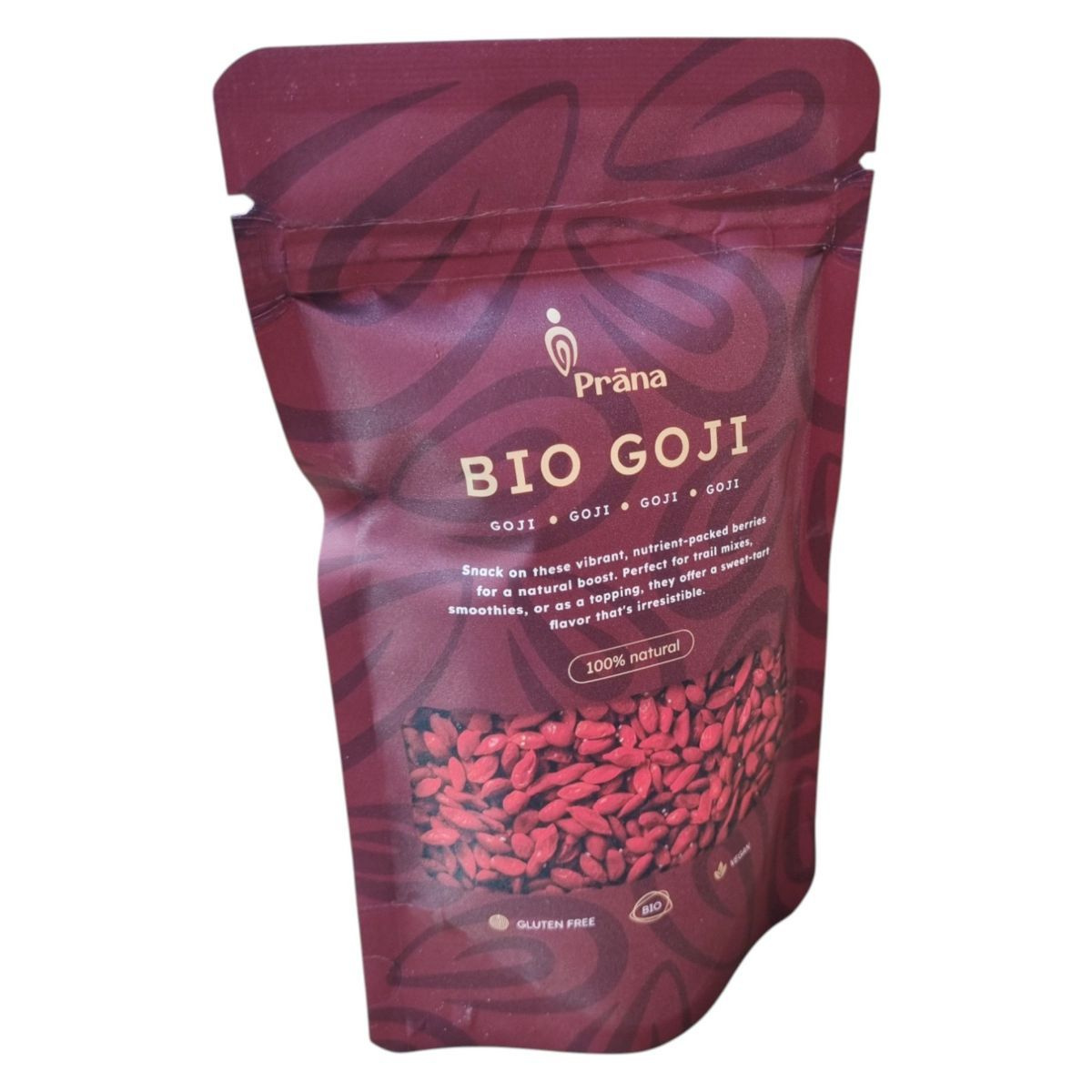 A Prána BIO GOJI goji bogyók Kínából származnak, és 100% bio minősítésűek. Ezek a bogyók antioxidánsokban gazdagok lehetnek, így hozzájárulhatnak az egészséges étrendhez. A termék ideális lehet különféle ételek, például reggeli müzlik vagy smoothie-k gazdagítására, de önmagában is fogyasztható. A termék gluténmentes, vegán és bio minősítésű, így különböző étrendi igényekhez is alkalmazkodhat. A terméket a Bio-Garancia (HU-ÖKO-02 Kft) tanúsítja.
