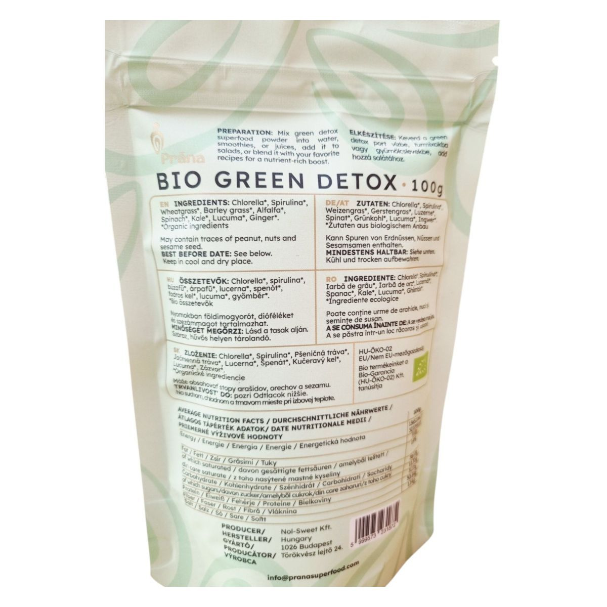 A Prāna BIO GREEN DETOX egy különleges superfood por, amely bio és vegán összetevőkből áll. A termék chlorella, spirulina, búzafű, árpafű, lucerna, spenót, kelkáposzta, lucuma és gyömbér keverékét tartalmazza, amelyek mindegyike bio minősítésű. A termék gluténmentes, így gluténérzékenyek is fogyaszthatják. A termék célja, hogy élénkítő és revitalizáló hatást nyújtson, és különféle italokba vagy ételekbe keverve fogyasztható. A termék csomagolása HU-ÖKO-02 tanúsítvánnyal rendelkezik, amely garantálja a bio minőséget. A termék nyomokban földimogyorót, dióféléket és szezámmagot tartalmazhat, ezért allergiásoknak érdemes figyelniük erre. A termék tárolása száraz és hűvös helyen ajánlott.