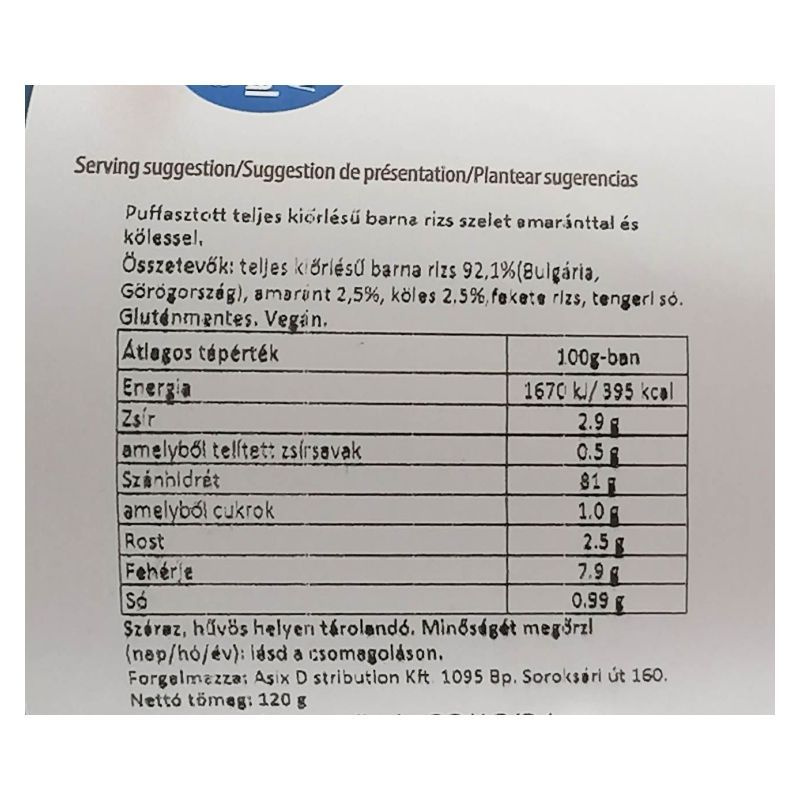 Összetevők: teljes kiőrlésű barna rizs 92%, fekete rizs, köles 3%, amaránt 2%, tengeri só.