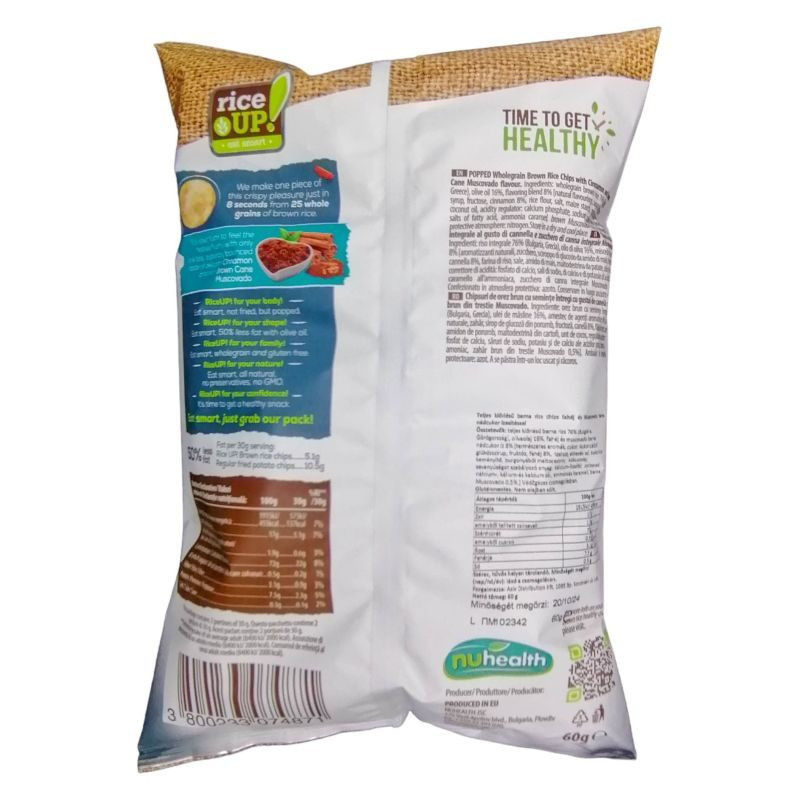 Összetevők: teljes kiőrlésű barna rizs 76% (Bulgária, Görögország), olívaolaj 16%, fahéj és muscovado barna nádcukor íz 8% [természetes aromák, cukor, kukoricából glükózszirup, fruktóz, fahéj 8%, rizsliszt, étkezési só, kukorica keményítő, burgonyából maltodextrin, kókuszolaj, savanyúságot szabályozó anyag: kálcium-foszfát, zsírsavak nátrium-, kálium-és kalcium sói, ammóniás karamell, barna Muscovado 0.5%.] Védőgázas csomagolásban.
