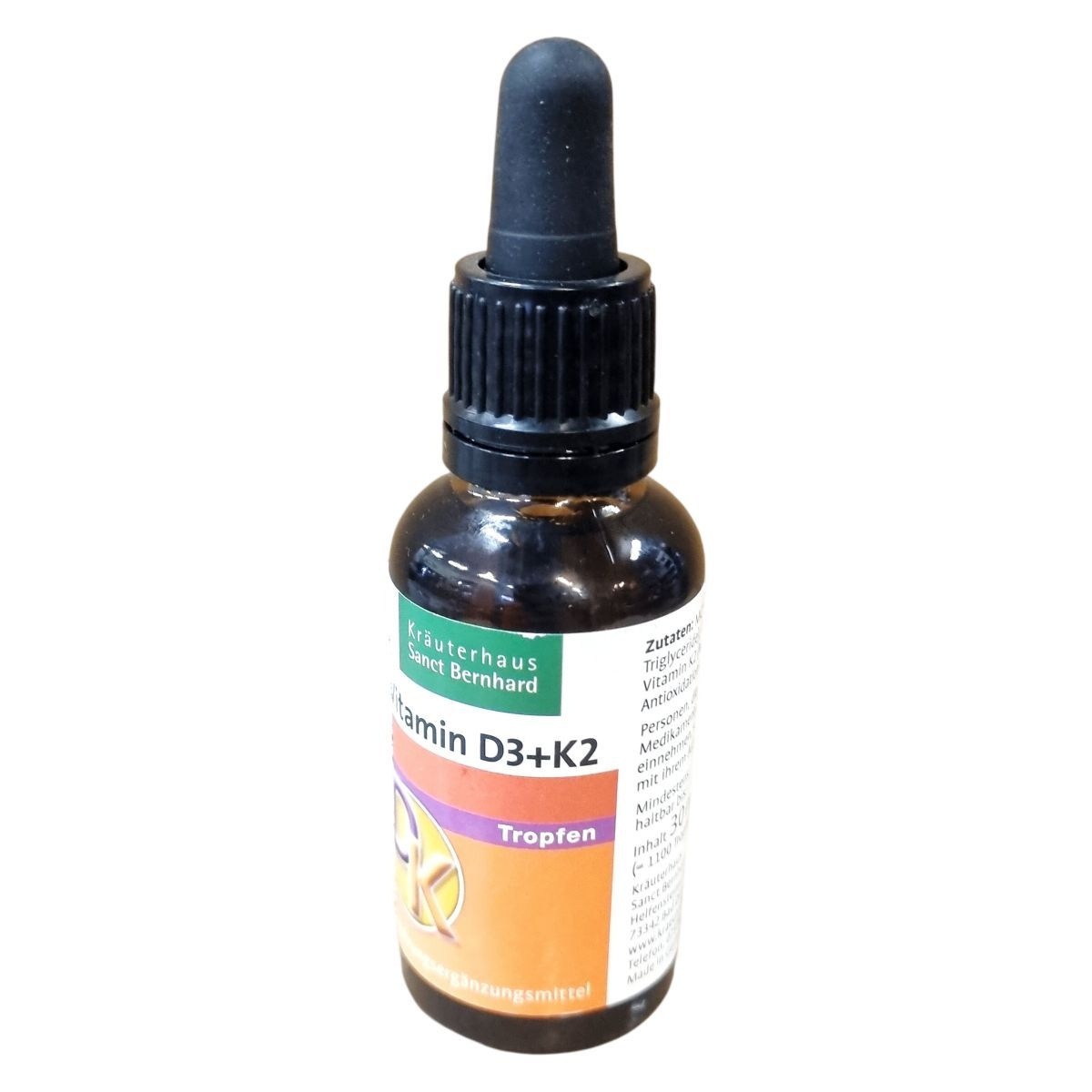 A Kräuterhaus Sanct Bernhard Vitamin D3+K2 csepp napi adagja 1 csepp, amely 25 µg D3-vitamint, vagyis 1000 NE-t, valamint 20 µg K2-vitamint tartalmaz. A K2-vitamin a D-vitamin hatásait egészítheti ki, elősegítheti a kalcium beépülését a csontokba, és hozzájárulhat a kalcium-érelmeszesedés megelőzéséhez. A termék közepes láncú triglicerideket (MCT olaj) és olivaolajat is tartalmaz, amelyek az aktív összetevők hordozójaként működnek. Az antioxidáns E-vitamin (alfa-tokoferol) védi a terméket az oxidációtól. Az adagolás praktikus pipettás üvegben történik, amely megkönnyíti a cseppentést. Az étrend-kiegészítő nem helyettesíti a kiegyensúlyozott, változatos étrendet és az egészséges életmódot.