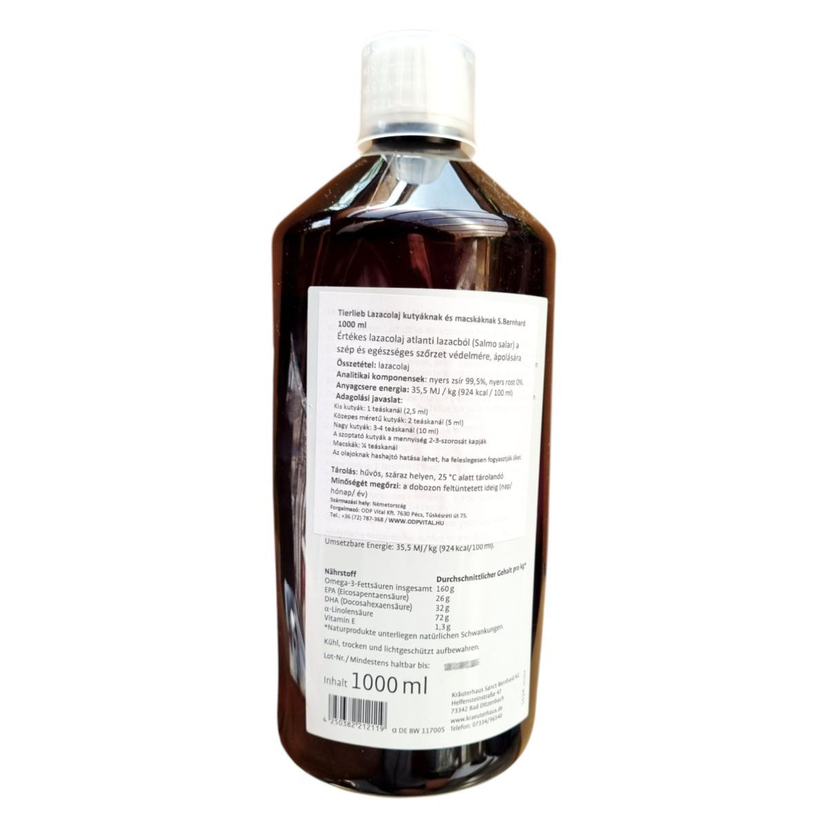 A Tierlieb Lazacolaj egy különleges étrend-kiegészítő kutyák és macskák számára, amely atlanti lazacból (Salmo salar) származik. A termék célja, hogy támogassa a háziállatok szőrzetének szépségét és egészségét. A lazacolaj gazdag omega-3 zsírsavakban, mint az EPA és DHA, amelyek hozzájárulhatnak a bőr és szőrzet egészségéhez. A termék használata során fontos betartani az ajánlott adagolást, mivel túlzott fogyasztása hashajtó hatású lehet. A lazacolajat hűvös, száraz helyen kell tárolni, hogy megőrizze minőségét.