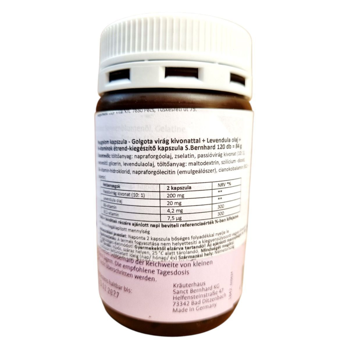 A Kräuterhaus Sanct Bernhard Lavendel Nerven-Kapseln levendulaolajat, passióvirág kivonatot, valamint B6- és B12-vitamint tartalmazhat, amelyek hozzájárulhatnak az idegrendszer normál működéséhez és a stressz csökkentéséhez.