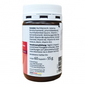 ligetszépe olaj, zselatin, bórágómagolaj, feketeribizlmag olaj, nedvesítő glicerin, E-vitamin, napraforgóolaj, csomósodást gátló szilicium-dioxid, B6-vitamin-hidrochlorid, vas-oxid színezék, B2-vitamin, B1-vitamin-mononitrát, folsav, biotin, B12-vitamin