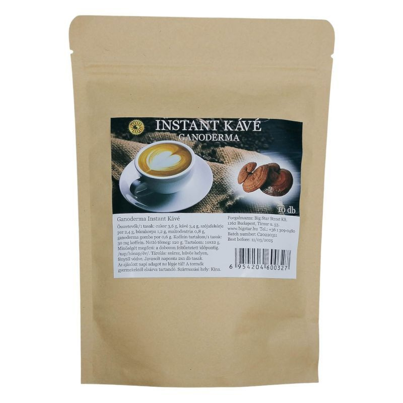 ÁTMELEGÍT, ÉLÉNKÍT. Tárolás: száraz, hűvös helyen, gyermekek elől elzártan. Összetevők: Cukor 3,6g, kávé 3,4g (koffein tartalom: 30mg), szójafehérje por 2,4g, búzakorpa 1,2g, maltodextrin 0,8g, ganoderma por 0,6g. Javasolt adag: napi 2x1 tasak. A javasolt adagot ne lépje túl!