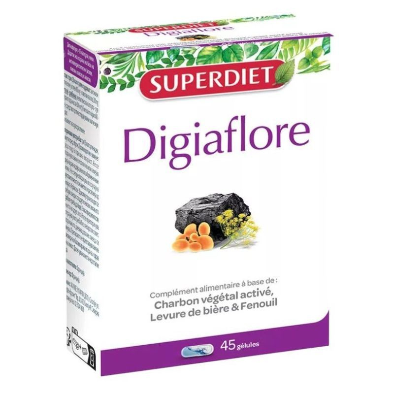 A Digiaflore kifejlesztéséhez a SUPERDIET laboratóriuma kombinálta a növényi aktív szenet, a sörélesztőt és az édesköményt. Növényi aktív szén: Az aktiválás égéssel történik, amelyet vízgőz jelenlétében hősokk követ, porózussá téve azt. Ezek a pórusok folyadék vagy gáz vonzására és megtartására alkalmasak. Az édesköményről ismert, hogy hozzájárul az emésztés támogatásához, komfortosabbá téve azt. Serkentheti az emésztőenzimek termelődését, segít csökkenteni a bélgörcsöket és a felesleges gázképződést. A sörélesztő B-vitaminokban gazdag, támogatja az emésztőrendszer egészséges működését, probiotikus hatású.Adagolás: 3 kapszula naponta, 30 perccel étkezés előtt. 6 év alatti gyermekek számára nem ajánlott.