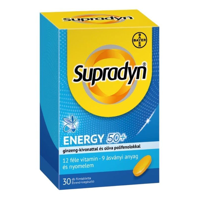 A Supradyn Energy 50+ kifejezetten az idősebb (50 év feletti) korosztály számára összeállított készítmény. Cink, mangán, jód, C-és E-vitamin-tartalma révén hozzájárul a sejtek oxidatív stresszel szembeni védelméhez. Számos vitamin és ásványi anyag mellett Ginzeng-kivonatot és olíva polifenolt is tartalmaz.