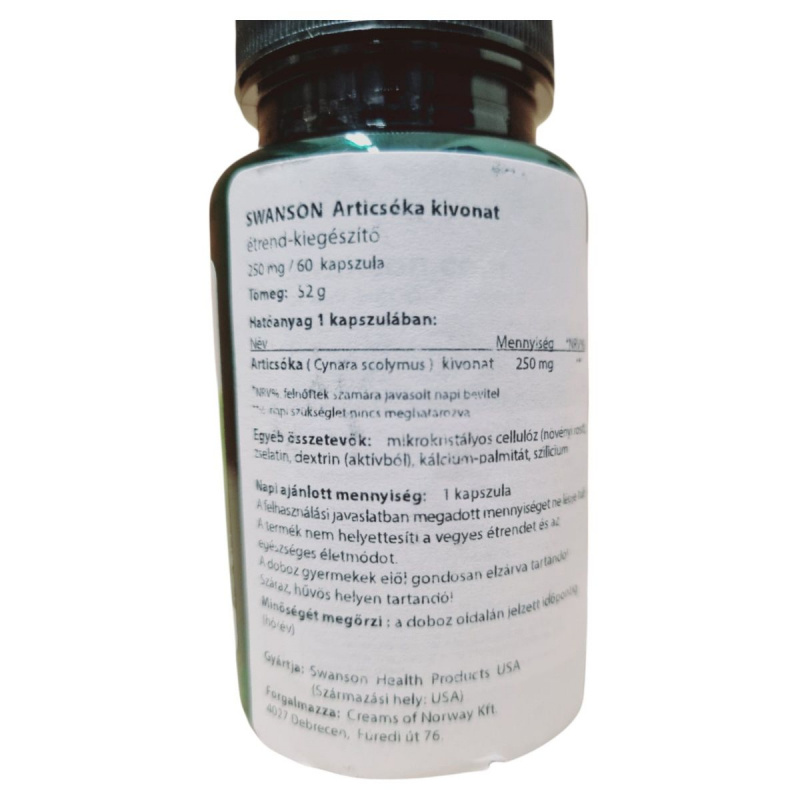 A SWANSON Articsóka kivonat egy étrend-kiegészítő, amely 250 mg articsóka kivonatot tartalmaz kapszulánként. Az articsóka kivonatot a Cynara scolymus növény leveléből nyerik, és standardizált formában tartalmazza a minimum 2.5% caffeoylquinic savat. A termék egyéb összetevői közé tartozik a mikrokristályos cellulóz, zselatin, dextrin, kálcium-palmitát és szilícium. A termék származási helye az USA, és a Creams of Norway Kft. forgalmazza Magyarországon. A termék használata során fontos, hogy a javasolt napi adagot ne lépjük túl, és tartsuk távol gyermekektől. A kapszulákat száraz, hűvös helyen kell tárolni.