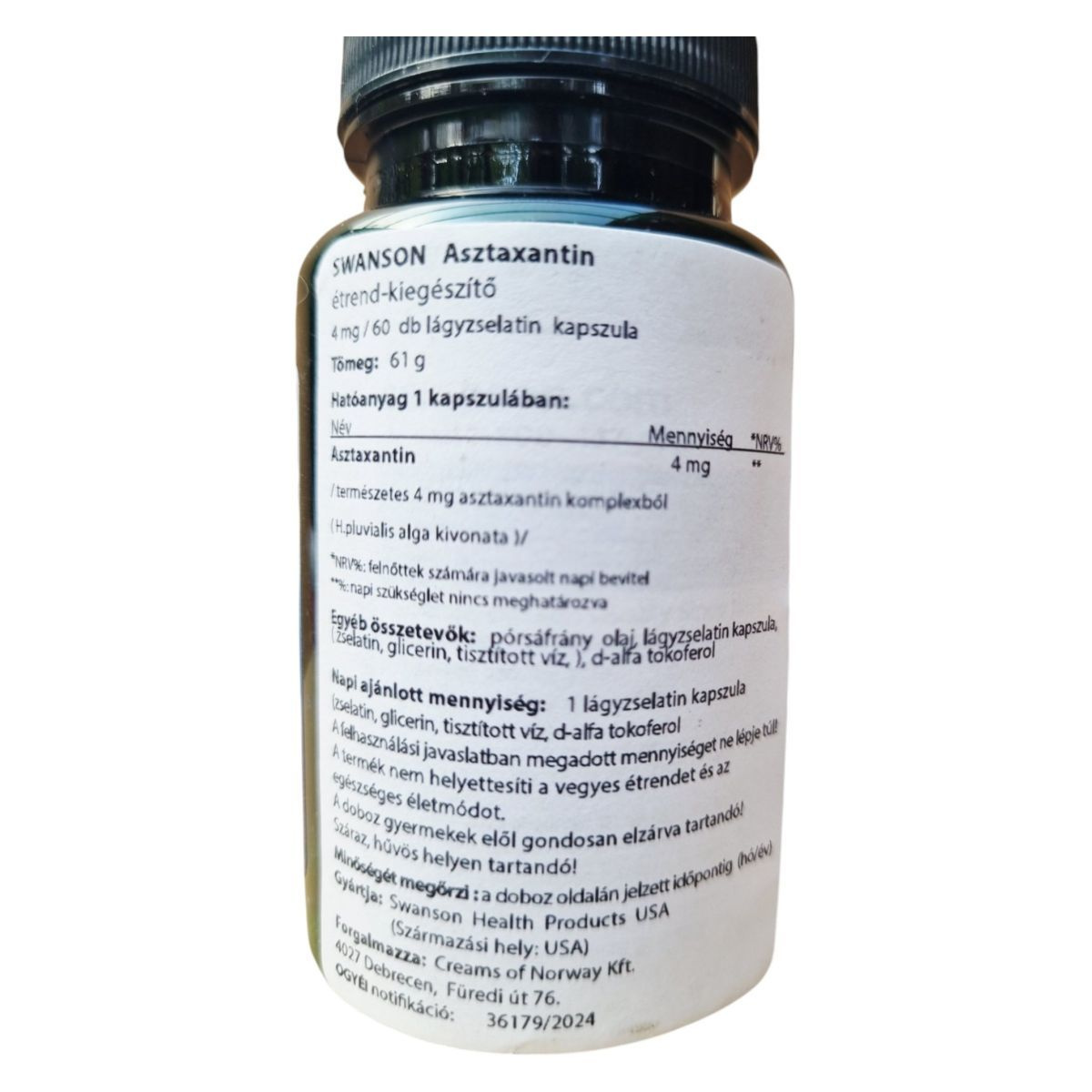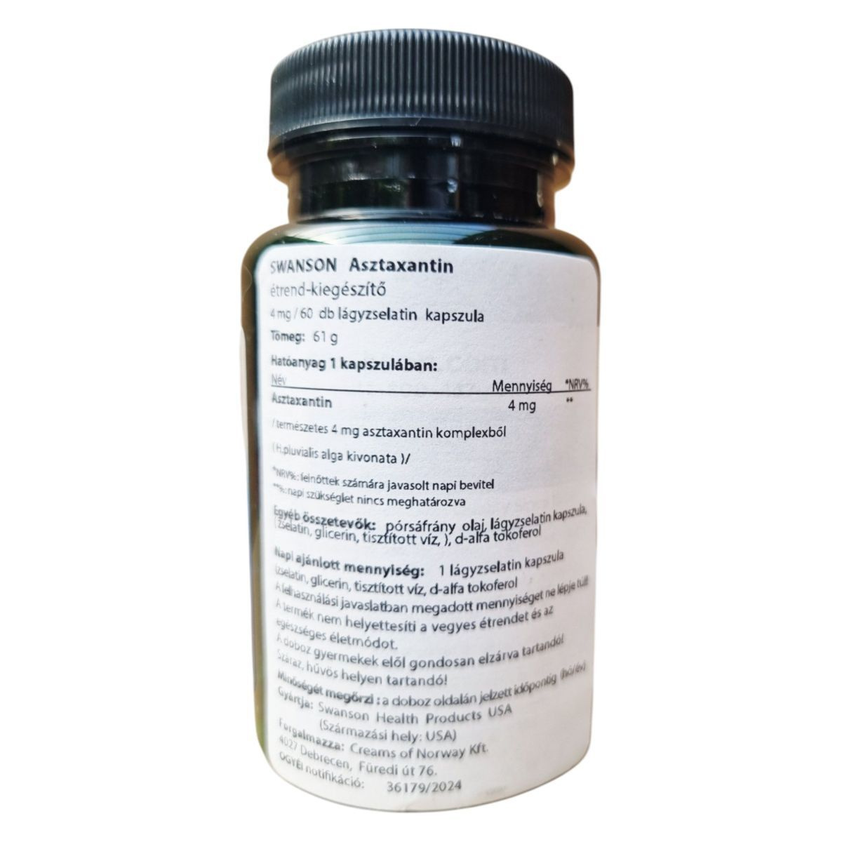 A SWANSON Asztaxantin étrend-kiegészítő 60 db lágyzselatin kapszulát tartalmaz, melyek mindegyike 4 mg természetes asztaxantint biztosít a H. pluvialis alga kivonatából. Az asztaxantin egy erős antioxidáns, amely hozzájárulhat az immunrendszer támogatásához és az oxidatív stressz csökkentéséhez. A termék pórsáfrány olajat, lágyzselatin kapszulát és d-alfa tokoferolt is tartalmaz. A napi ajánlott mennyiség 1 kapszula, amelyet nem szabad túllépni. A termék nem helyettesíti a vegyes étrendet és az egészséges életmódot, és gyermekek elől gondosan elzárva tartandó. Tárolása száraz, hűvös helyen javasolt. Forgalmazza a Swanson Health Products USA, és a termék OGYÉI notifikációs száma 36179/2024.