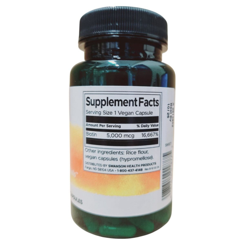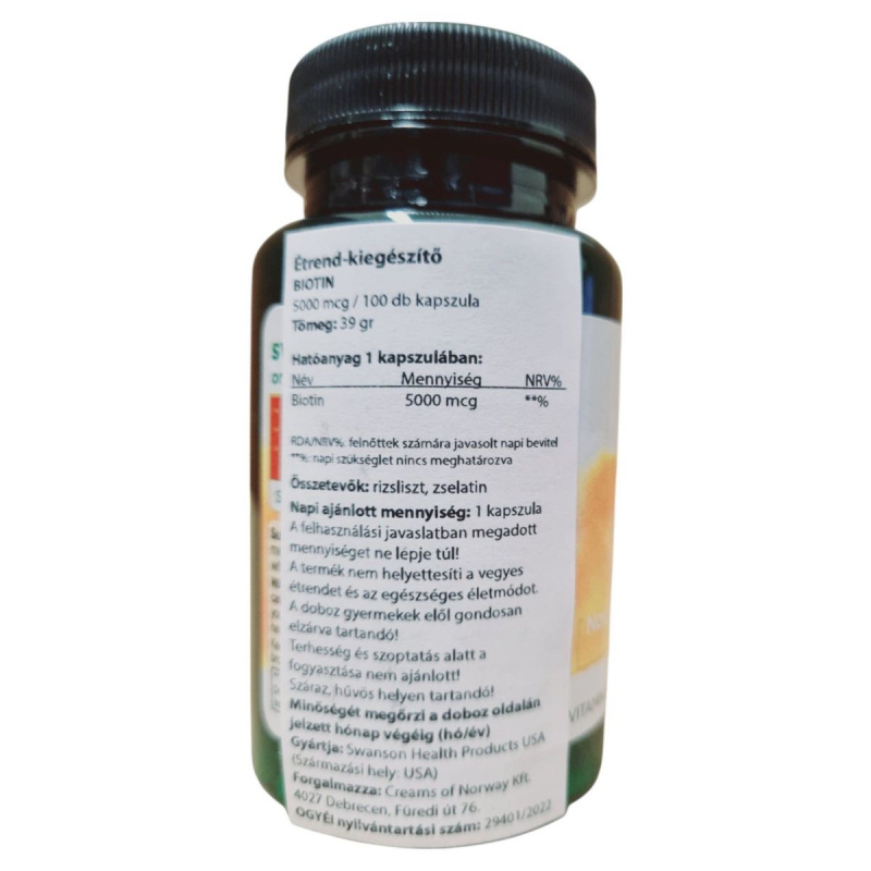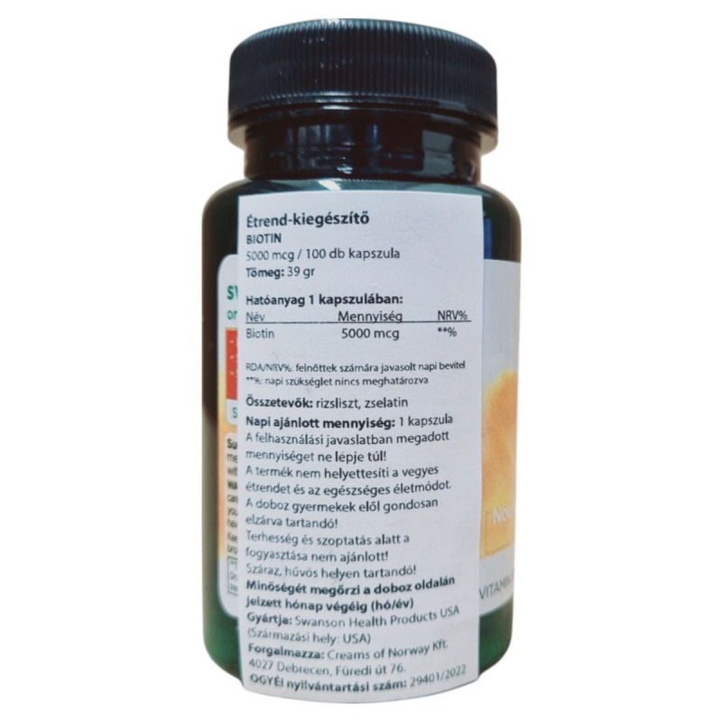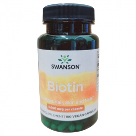 A Swanson Biotin étrend-kiegészítő kapszula formájában kínálja a biotint, amely egy fontos B-vitamin. A termék 5000 mcg biotint tartalmaz kapszulánként, ami hozzájárulhat a haj, a bőr és a köröm egészségének fenntartásához. A kapszulák rizslisztet és zselatint tartalmaznak. A termék használata során fontos, hogy ne lépjük túl a javasolt napi adagot, és tartsuk távol gyermekektől. A termék terhesség és szoptatás alatt nem ajánlott. A Swanson Health Products által gyártott terméket a Creams of Norway Kft. forgalmazza Magyarországon.