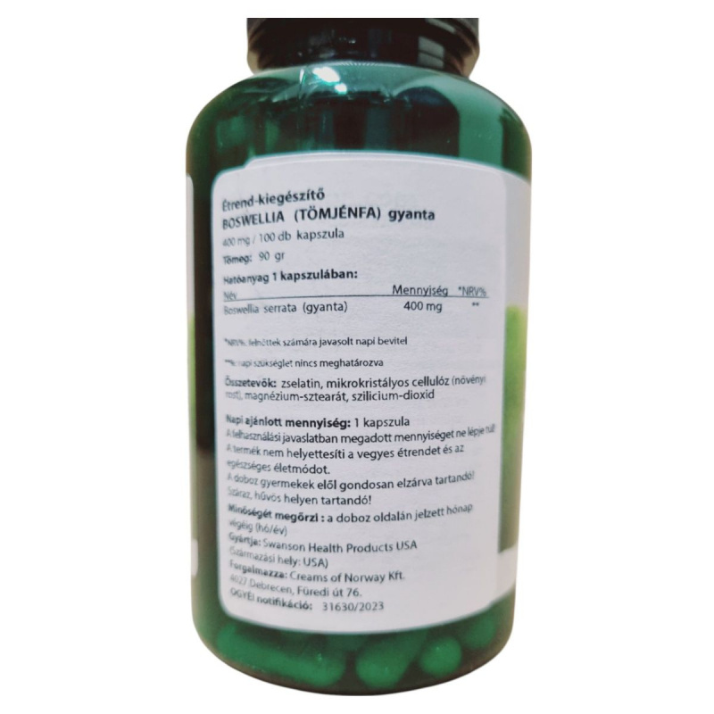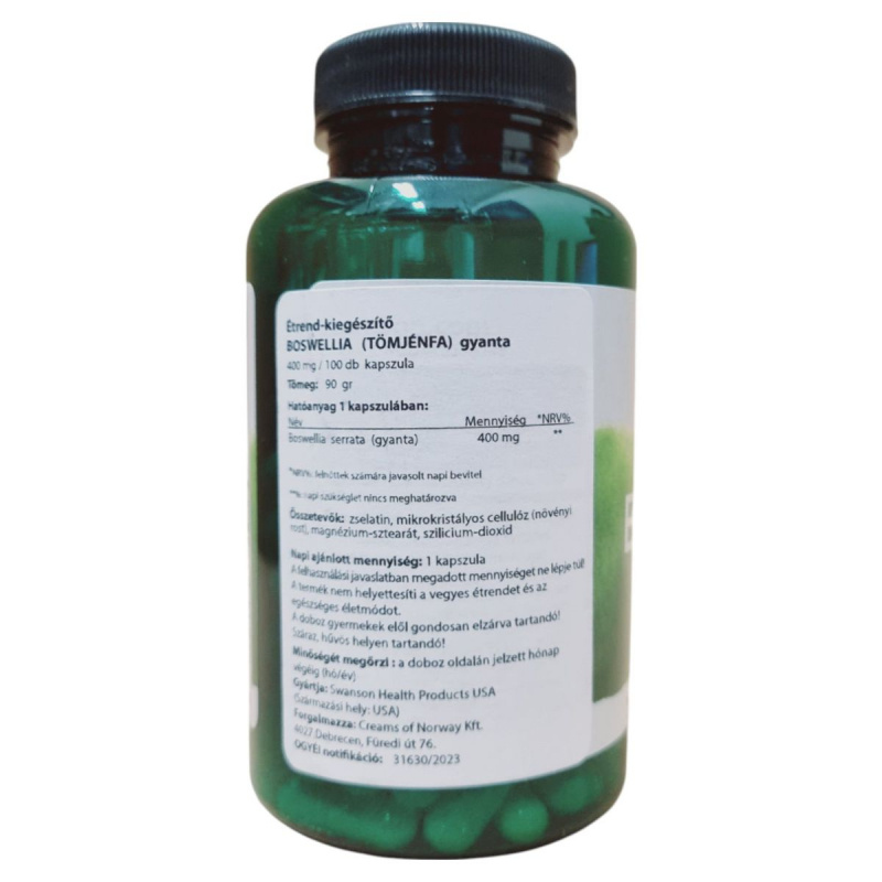 A Swanson Boswellia (Tömjénfa) gyanta kapszula egy étrend-kiegészítő, amely 400 mg Boswellia serrata gyantát tartalmaz kapszulánként. A termék napi egy kapszula fogyasztását javasolja, amely segíthet a szervezet egészségének támogatásában. Az összetevők között található zselatin, mikrokristályos cellulóz, magnézium-sztearát és szilícium-dioxid. A termék nem helyettesíti a vegyes étrendet és az egészséges életmódot, és gyermekek elől elzárva tartandó. A kapszulák száraz, hűvös helyen tárolandók. A terméket a Swanson Health Products gyártja és a Creams of Norway Kft. forgalmazza Magyarországon. Az OGYÉI notifikációs száma 31630/2023.