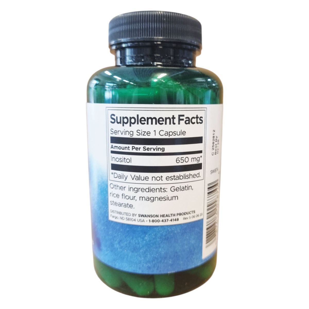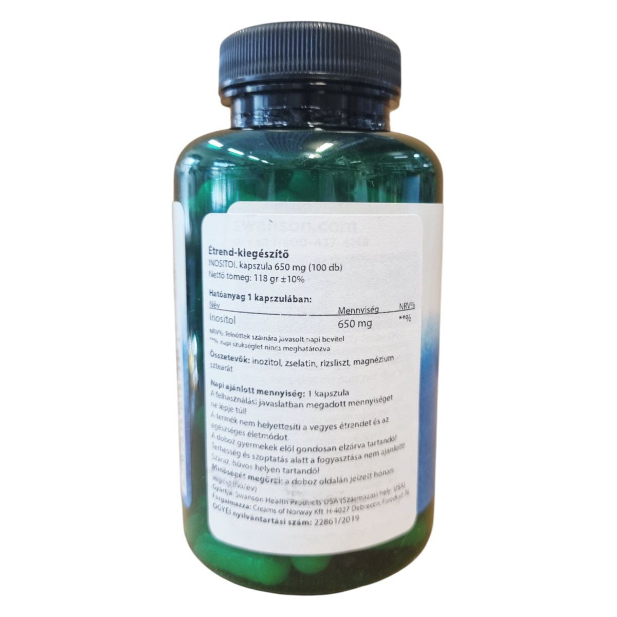 A Swanson Inositol kapszula egy étrend-kiegészítő, amely 650 mg inozitolt tartalmaz kapszulánként. Az inozitol egy fontos tápanyag, amely hozzájárulhat a sejtek egészséges működéséhez és támogathatja a mentális jólétet. A termék összetevői között megtalálható a zselatin, rizsliszt és magnézium-sztearát. Az ajánlott napi mennyiség 1 kapszula, amelyet nem szabad túllépni. A termék nem helyettesíti a vegyes étrendet és az egészséges életmódot, és terhesség vagy szoptatás alatt nem ajánlott a fogyasztása. A terméket száraz, hűvös helyen kell tárolni, és gyermekek elől elzárva tartandó. Az OGYÉI nyilvántartási száma: 22861/2019.