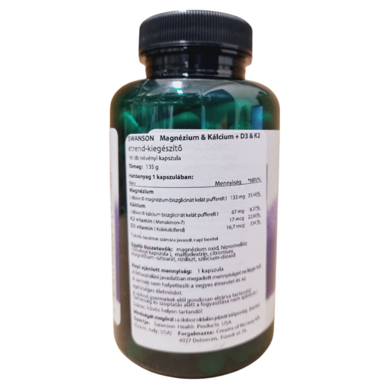 A SWANSON Magnézium + Kálcium + D3 + K2 étrend-kiegészítő egy komplex formula, amely magnéziumot és kálciumot tartalmazhat, amelyek fontosak lehetnek a csontok és az izmok normál működéséhez. A D3 és K2 vitaminok hozzájárulhatnak a kalcium megfelelő felszívódásához és hasznosulásához a szervezetben. A termék növényi kapszulák formájában kapható, így vegetáriánusok számára is alkalmas lehet. A termék használata során fontos betartani az ajánlott napi mennyiséget, és figyelni arra, hogy a termék nem helyettesíti a kiegyensúlyozott étrendet és az egészséges életmódot.