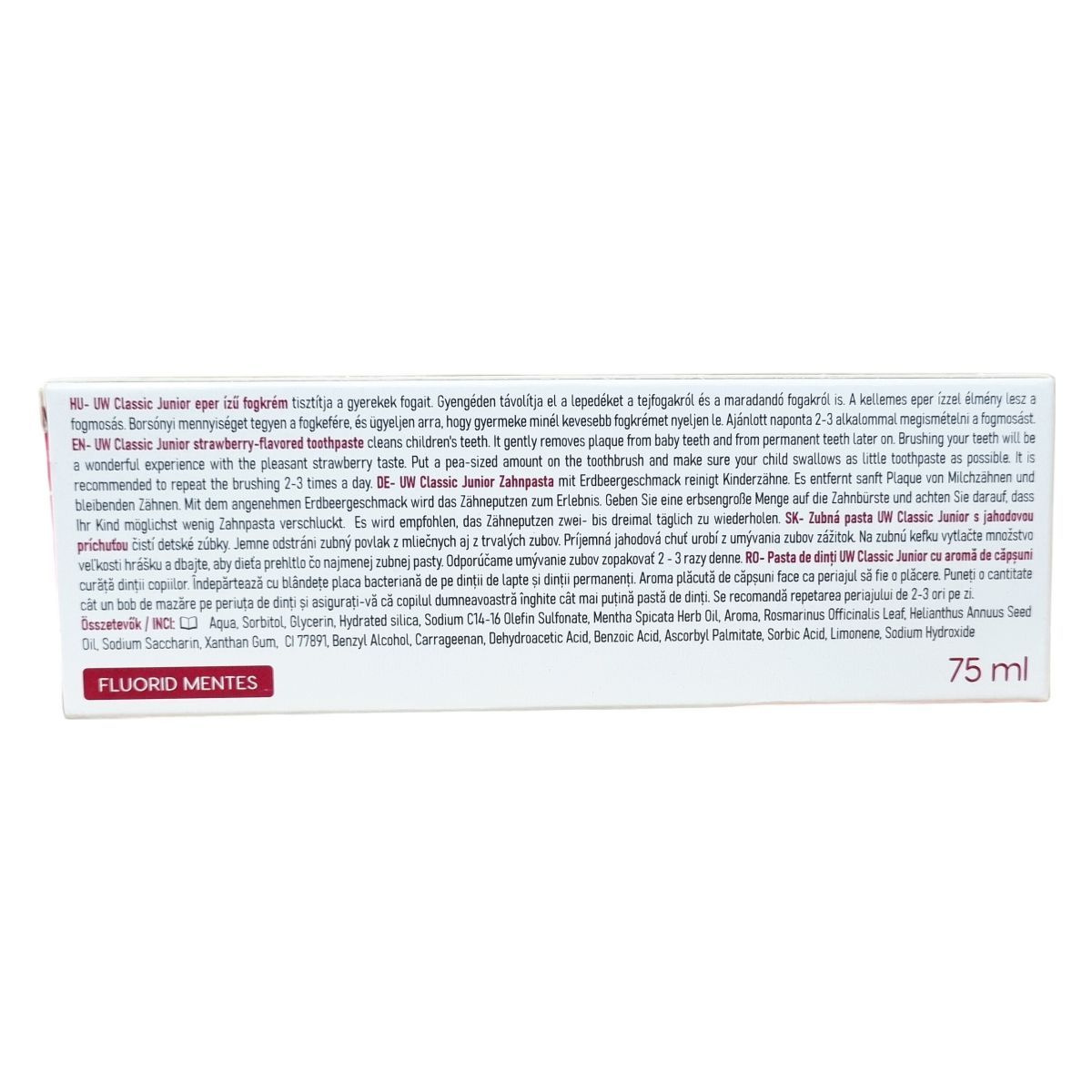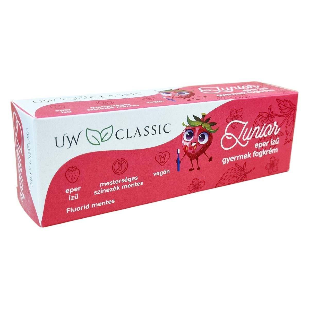 Az UW Classic Junior eper ízű fogkrém kellemes és élvezetes fogmosást biztosít a gyermekeknek, miközben hatékonyan tisztítja a tej- és maradandó fogakat. Habos állaga segíti a könnyű használatot, a természetes hatóanyagok pedig gyengéden távolítják el a lepedéket, friss és csodás leheletet biztosítva. A termék mesterséges színezékektől mentes és fluorid nélkül készült, így kíméletes választás a kicsik számára. Praktikus kiszerelése, 75 ml, ideális a mindennapi használathoz, elősegítve a helyes fogápolási szokások kialakulását már korán.