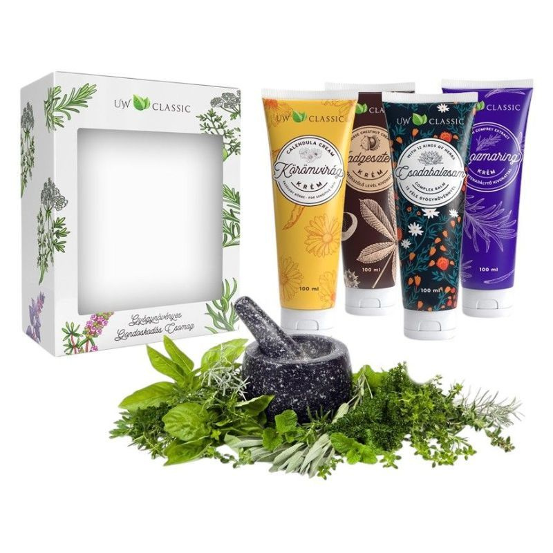 Tökéletes ajándék lehet szeretteidnek! A csomag tartalma: UW Classic Vadgesztenye krém Vörösszőlő levél kivonattal 100ml, UW Classic Csodabalzsam 100ml, UW Classic Rozmaring krém Feketenadálytő kivonattal 100ml, UW Classic Körömvirág krém 100ml.