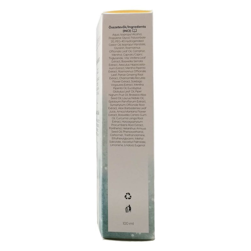 A feketenadálytő csont és csontszövet regeneráló hatásáról ismert, a benne található hatóanyagok javíthatják a szövetek vérellátását, segítve a vérömlenyek, véraláfutások felszívódását. Az árnika gyulladáscsökkentő és fájdalomcsillapító hatású. A kurkuma antioxidáns hatású gyógynövény, kivonata a reumatikus fájdalmak kiegészítő ápolására szolgál. Az ördögcsáklya gyulladásgátló és fájdalomcsillapító összetevő, a mozgásképesség javulását segíti elő. A vörösszőlő levél antioxidáns, serkenti a vénás keringést. Az aloe vera kivonat hidratáló, baktérium-, vírus-, és gombaölő hatású, serkenti a sejtregenerációt. A készítményben találhatóak természetes olajok is: babérlevél, borsmenta, tömjén, eukaliptusz, fodormenta, feketebors, mustármag, rozmaring.Aqua, Isopropyl Alcohol, Propylene Glycol, Polysorbate 20, PEG-40 Hydrogenated Castor Oil, Isopropyl Myristate, Glycerin, Rosmarinus Officinalis Leaf Oil, Camphor, Menthol, Caprylic/Capric Triglyceride, Vitis Vinifera Leaf Extract, Boswellia Serrata Extract, Aesculus Hippocastanum Extract, Mentha Piperita Extract, Rosmarinus Officinalis Leaf, Panax Ginseng Root Extract, Chamomilla Recutita Flower Extract, Solidago Virgaurea Extract, Mentha Piperita Oil, Eucalyptus Globulus Leaf Oil, Piper Nigrum Fruit Oil, Brassica Alba Seed Oil, Laurus Nobilis Oil, Epilobium Parviflorum Extract, Symphytum Officinale Root Extract, Aloe Barbadensis Leaf Juice, Arnica Montana Flower Extract, Boswellia Carterii Gum Oil, Curcuma Longa Root Extract, Harpagophytum Procumbens Root Extract, Panthenol, Helianthus Annuus Seed Oil, Phenoxyethanol, Carbomer, Triethanolamine, Ethylhexylglycerin, Methyl Salicylate, Ascorbyl Palmitate, Limonene, Linalool, Eugenol.