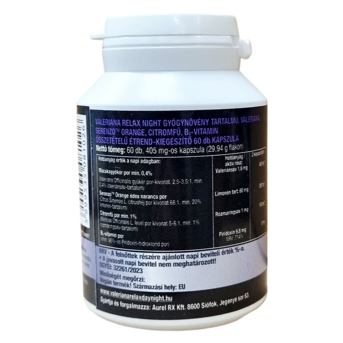 A Valeriana Relax Night egy gyógynövény-tartalmú étrend-kiegészítő, amely macskagyökér kivonatot, Serenzo Orange édes narancs por kivonatot, citromfű por kivonatot és B6-vitamint tartalmaz. A kapszula készítése vegán cellulózhéjban történik. A termék összetevői között a macskagyökér 0,4%-os valeránsav tartalommal, a Serenzo Orange citrushéj porének 20% limonén tartalommal, a citromfű por 1% rozmaringsav tartalommal, a B-vitamin pedig minimum 98%-os piridoxin-hidroklorid por formájában fordul elő. A termék EU-ból származik és vegan minősítéssel rendelkezik. Fogyasztása javasolt felnőtteknek, azonban várandós és szoptató kismamák, kisgyermekek, valamint összetevőkre allergiás vagy érzékeny személyek számára nem ajánlott. A termék fokozhatja az alkohol és a benzodiazepinek nyugtató hatását, ezért gépjárművezetés vagy fokozott figyelmet igénylő tevékenységek esetén körültekintően használandó. Az ajánlott napi adagot nem szabad túllépni.