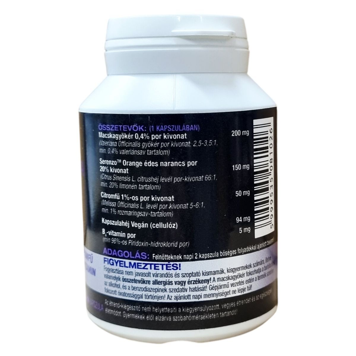 Macskagyökér por kivonat, Serenzo Orange édes narancs por, citromfű por kivonat, B-vitamin por (piridoxin-hidroklorid), kapszulahéj (vegán cellulóz)