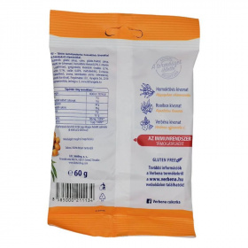 Töltött keménycukorka homoktövissel, naranccsal, hozzáadott C+D vitaminnal.
