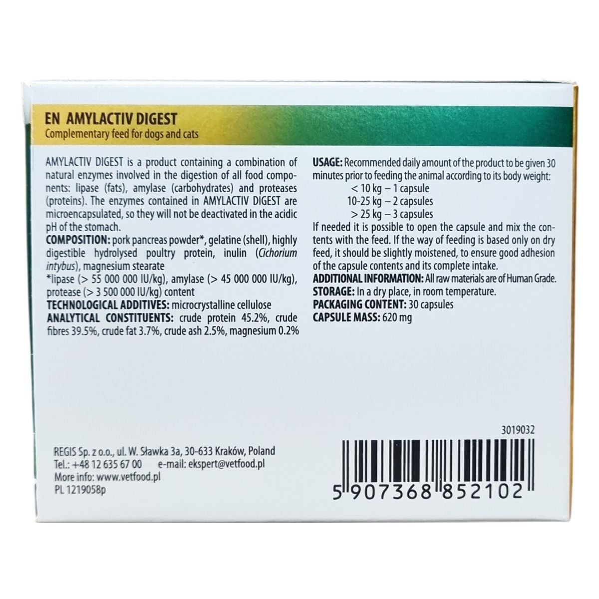 Az Amylactiv Digest természetes enzimek kombinációját tartalmazza (lipáz, amiláz, proteáz), amelyek támogathatják a zsírok, szénhidrátok és fehérjék emésztését. Az enzimeket védett, mikrokapszulázott formában tartalmazza, így azok a gyomor savas közegében nem inaktiválódnak. Szükség szerint a kapszula felnyitható és tartalma az eleséghez keverhető. Ha az állat száraz tápot kap, érdemes azt enyhén megnedvesíteni a kapszula tartalmának megfelelő tapadása érdekében. Minden alapanyag emberi fogyasztásra alkalmas minősítésű.