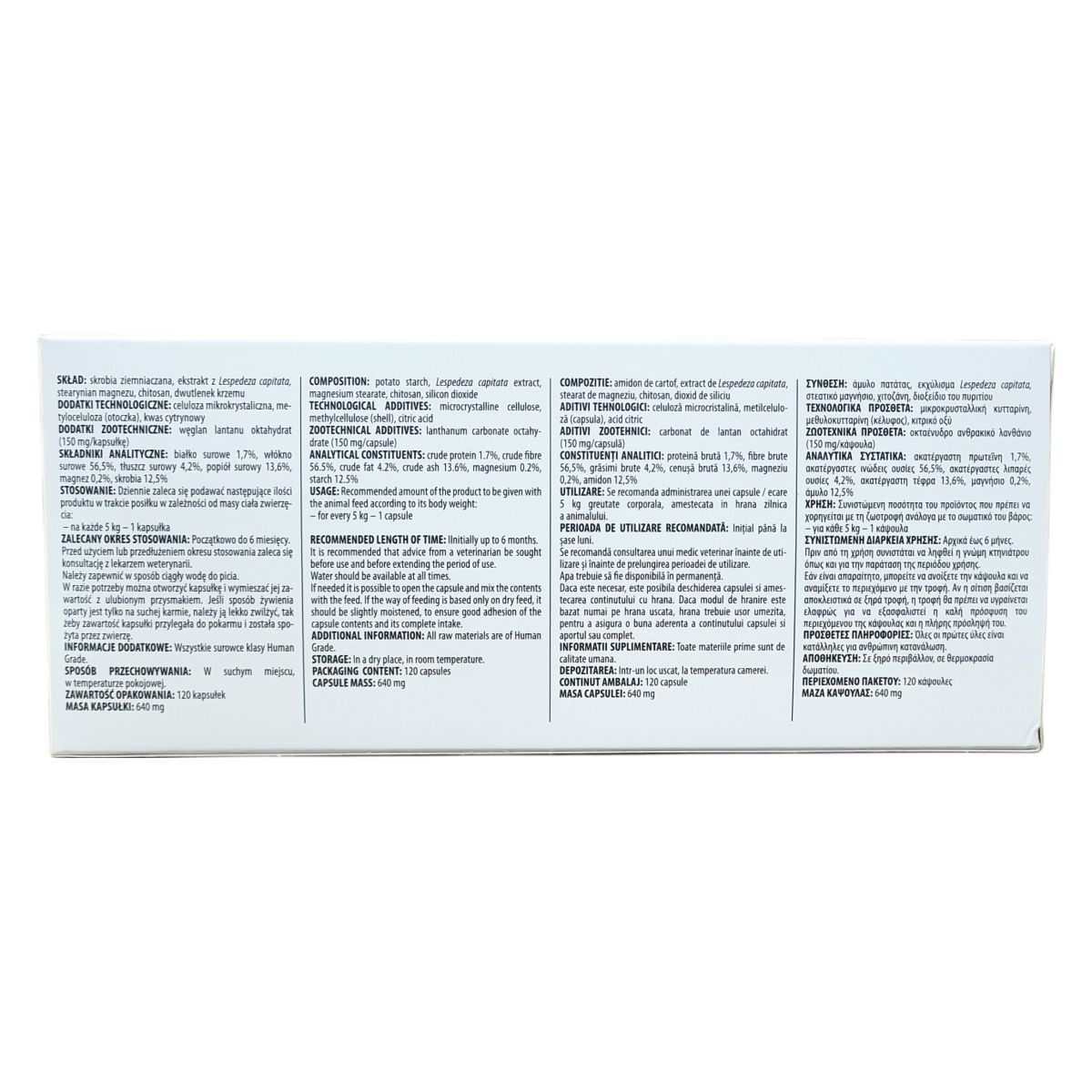 burgonyakeményítő, Lespedeza capitata-kivonat, magnézium-sztearát, kitozán, szilicium-dioxid